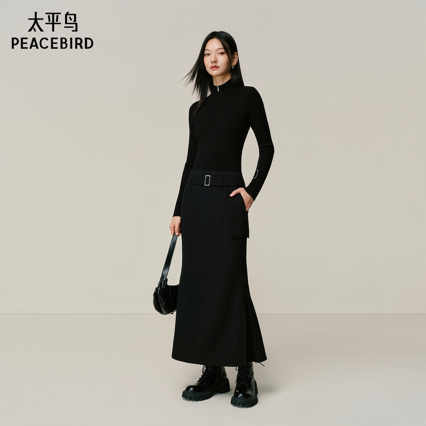 【商场同款】太平鸟黑色鱼尾中长裙女本布腰带半身裙A3GFF4434