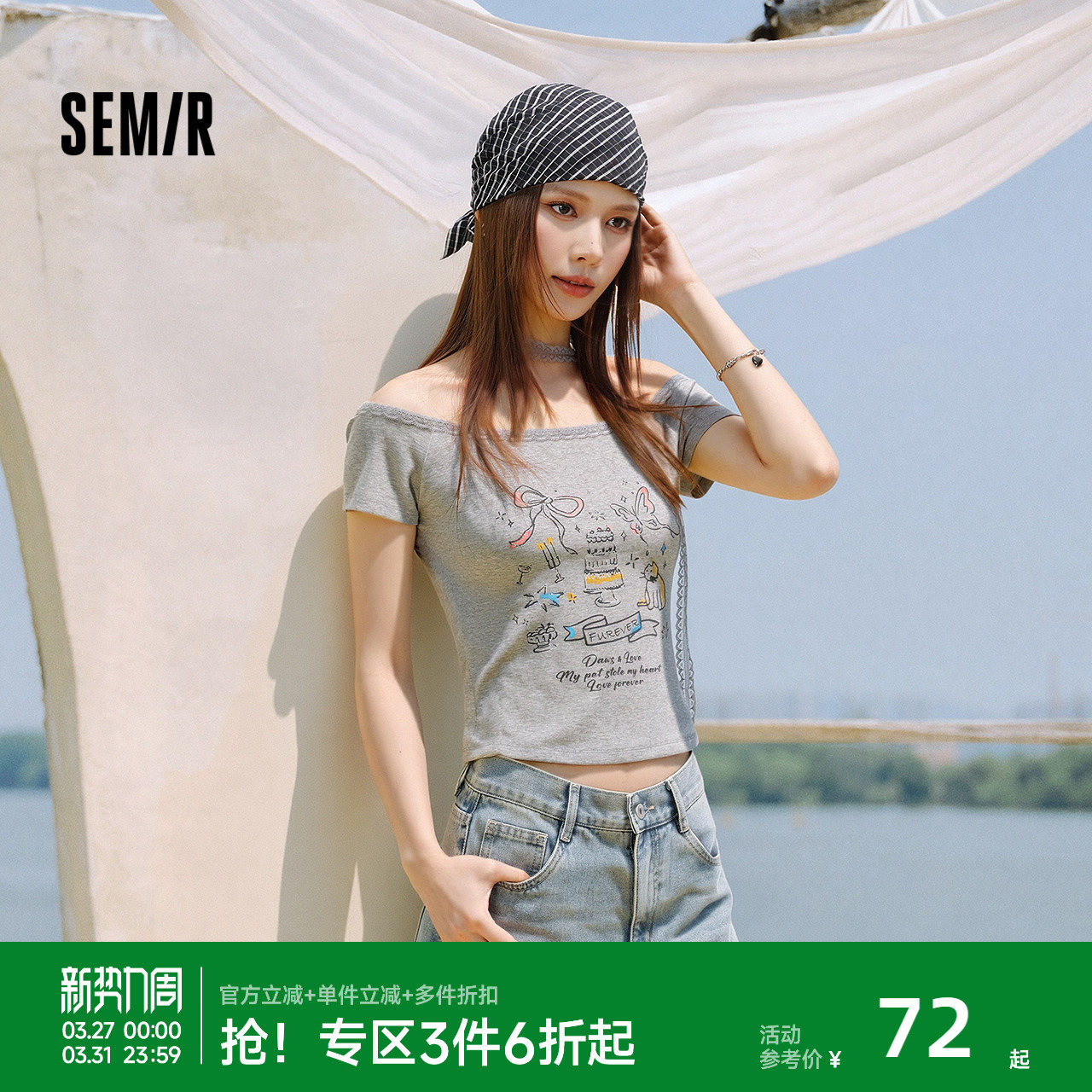 森马短袖T恤女夏季短款蕾丝一字领印花紧身2026新款甜酷辣妹上衣