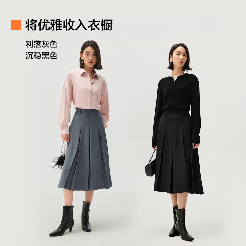 HLA/海澜之家气质半身裙24秋季新款长款显瘦商务A字百褶裙子女装