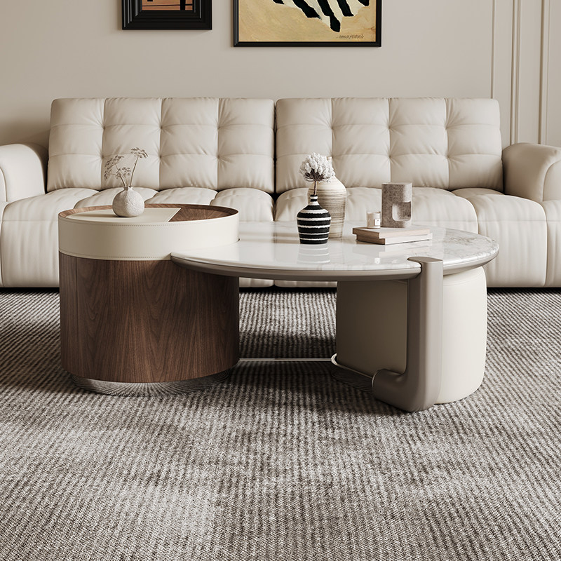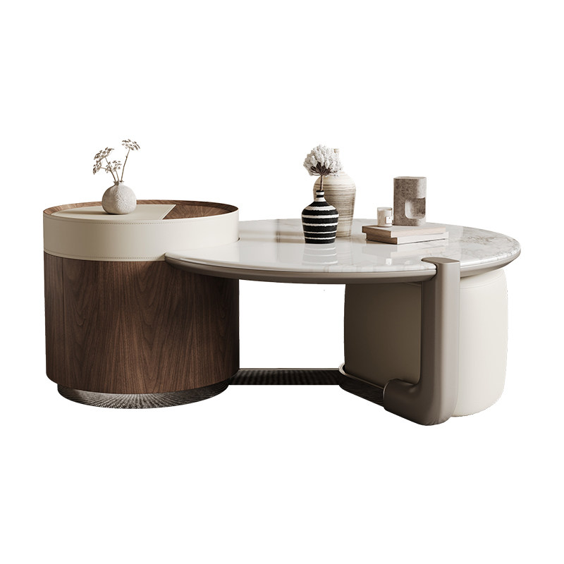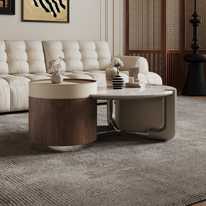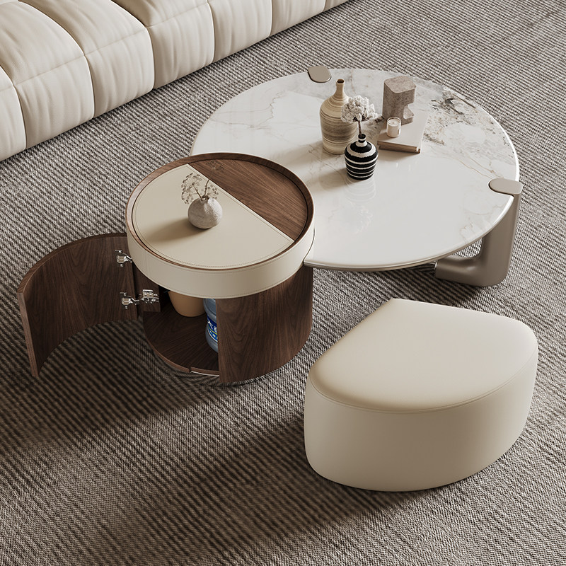 中古风微晶石茶几圆形家用现代简约北欧小户型轻奢带储物茶桌组合
