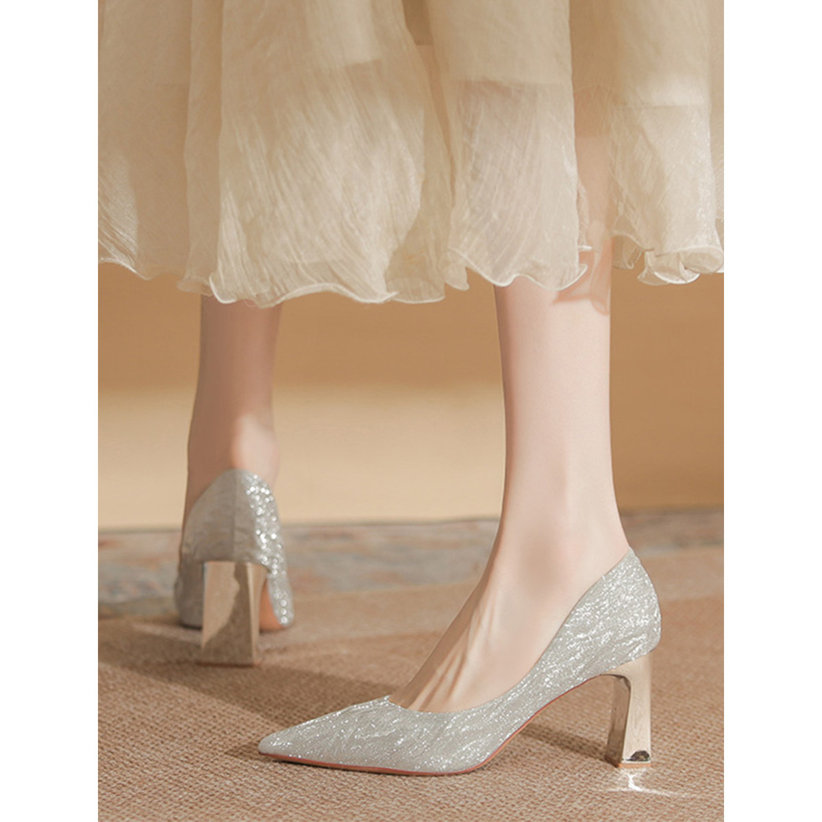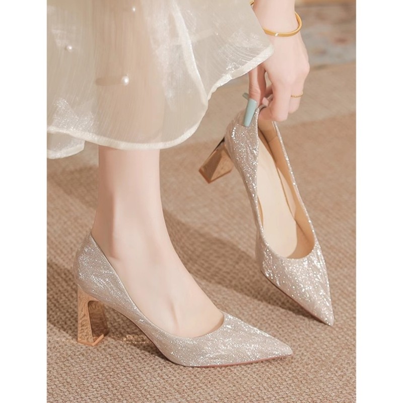 婚鞋女2024年新款主婚纱新娘鞋亮片香槟色水晶鞋尖头细跟高跟鞋女