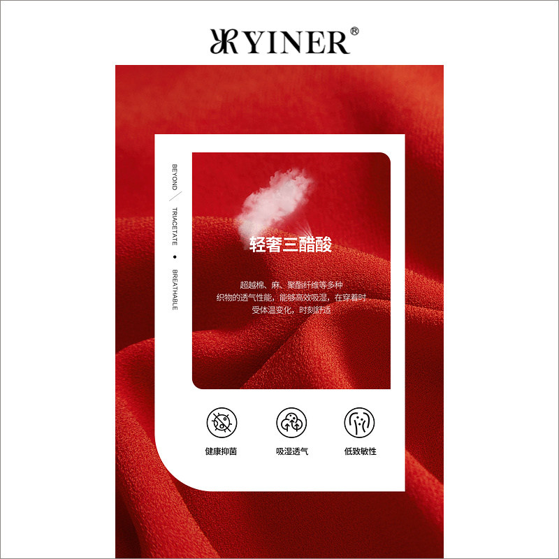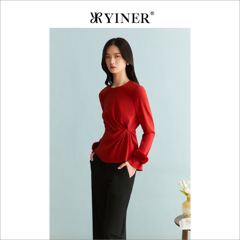 【中国红】YINER音儿女装冬季醋酸貂皮袖带收褶安可拉红衬衫
