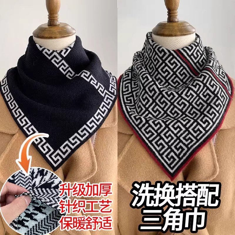 冬季三角巾围巾脖千鸟格女针织毛线小巾时尚百搭假领保暖护颈脖套