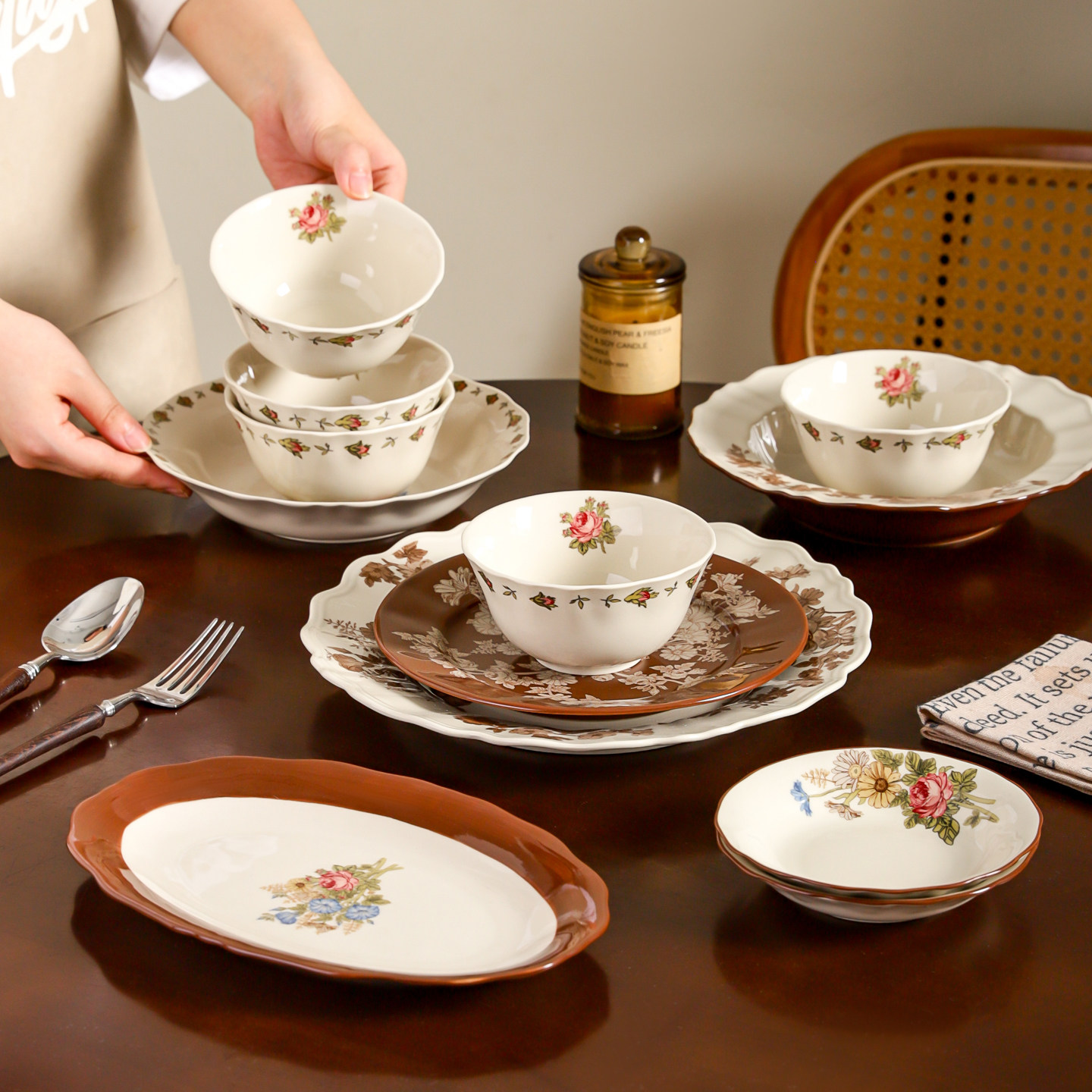 奶油风陶瓷碗家用卡通菜盘子可爱米饭碗汤碗釉下彩儿童餐具耐高温
