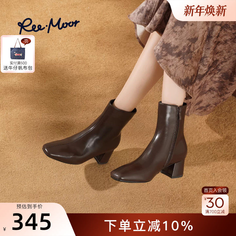 REEMOOR睿慕2025秋季新款英伦风方头粗跟增高短靴女侧拉链瘦瘦靴