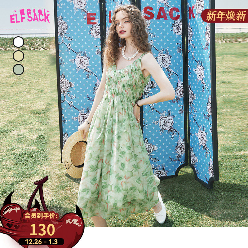 妖精的口袋绿色吊带连衣裙女2025夏季新款性感v领碎花度假风裙子