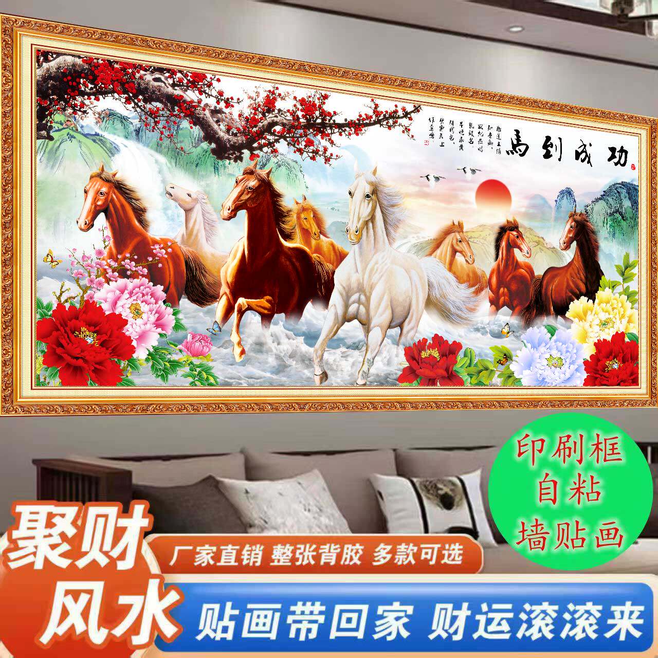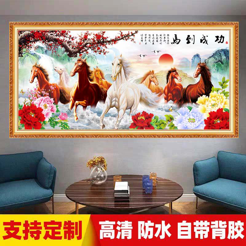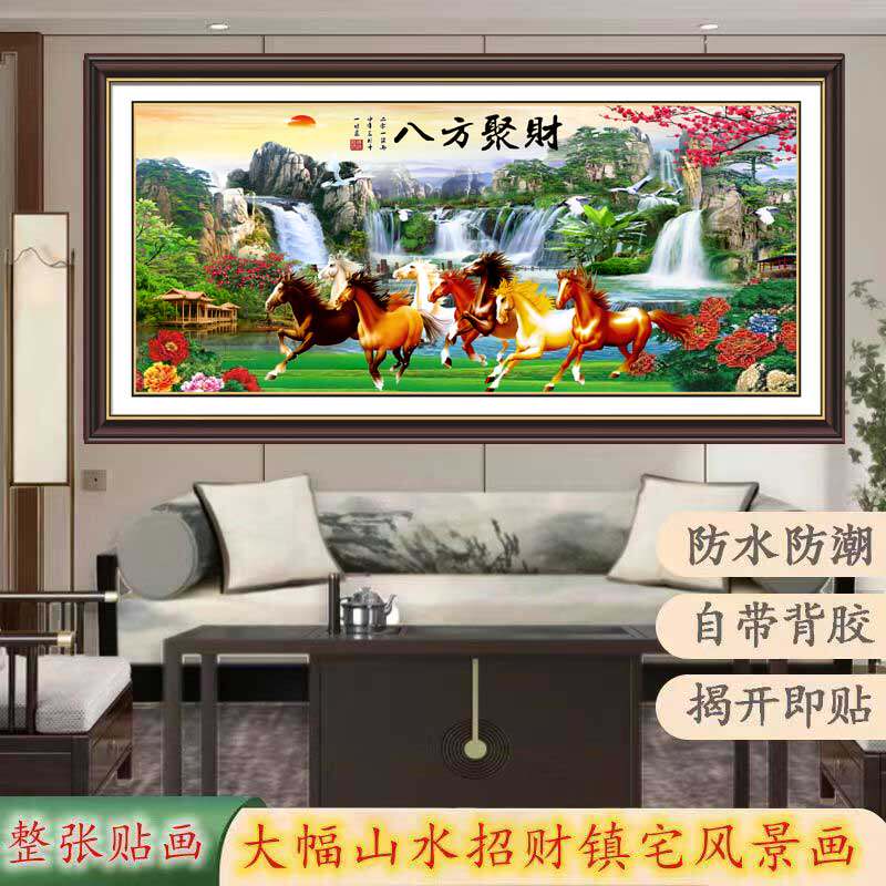 八骏图壁画自粘墙贴中式山水沙发背景墙客厅装饰画马到成功玄关