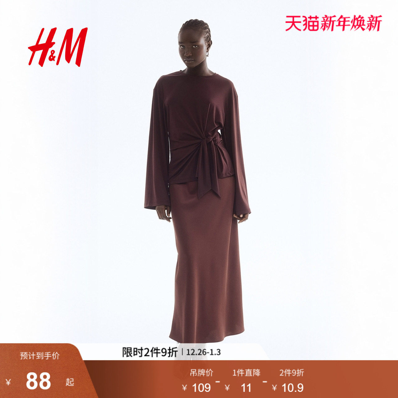 HM女装T恤2025年冬季新款圆领内搭系带设计礼服长袖上衣1310088