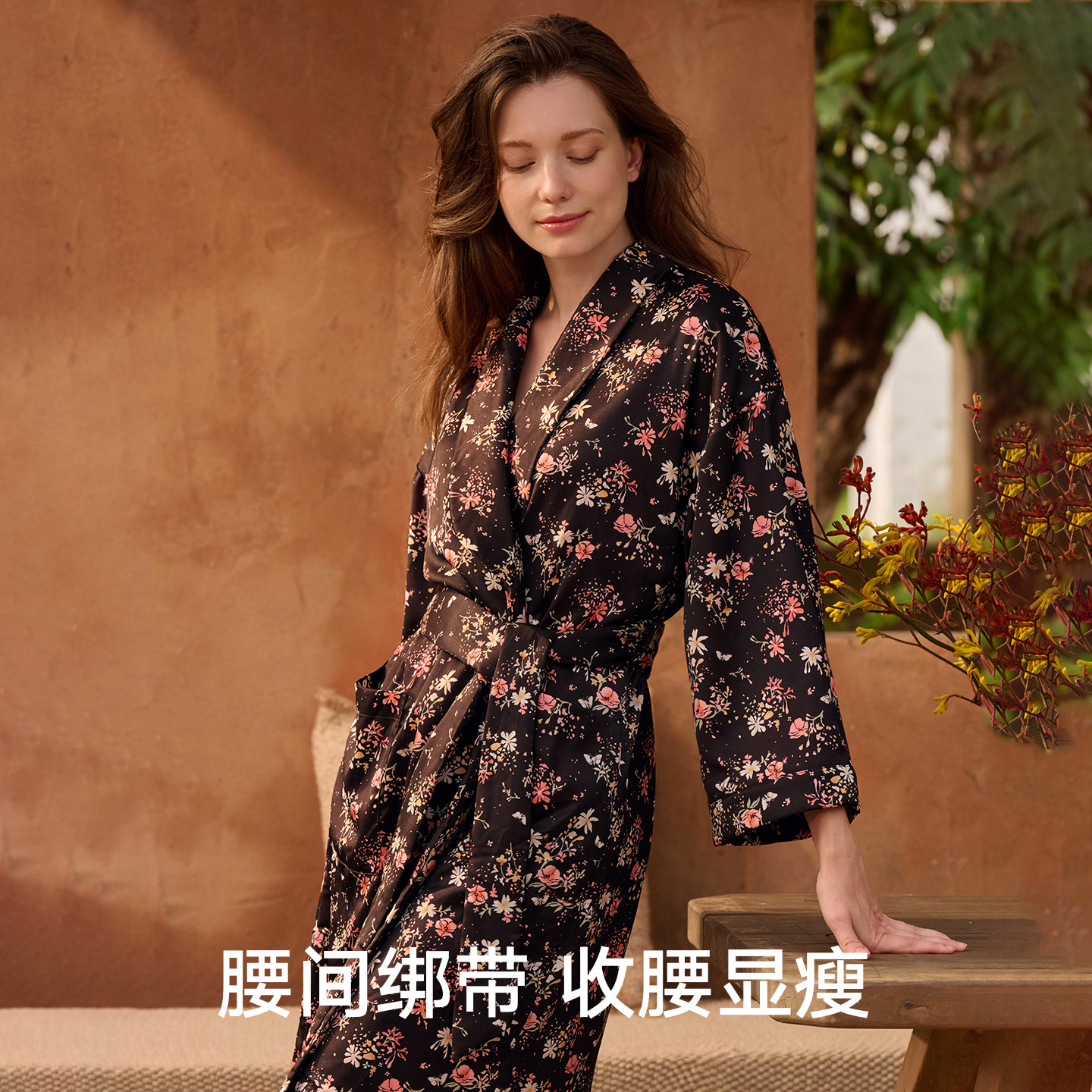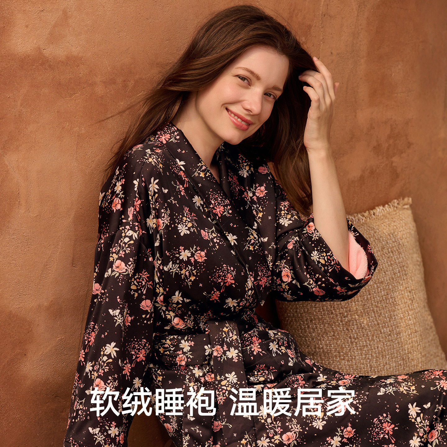 曼妮芬中式长袖长袍轻绒睡袍女士舒适翻领度假起居家居服20320796