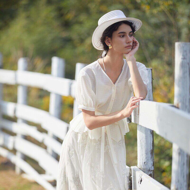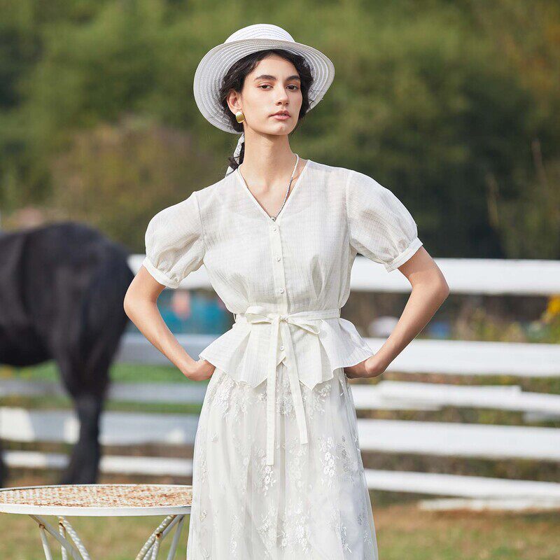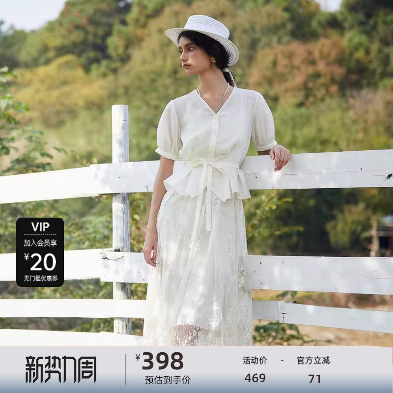 【波嬉系】sdeer圣迪奥法式优雅V领收腰绣花连衣裙套装S24261401