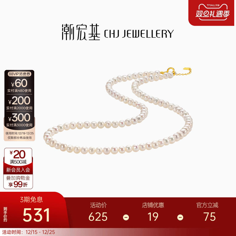 潮宏基小确幸珍爱心缘黄18k金珍珠项链淡水珠锁骨链生日礼物