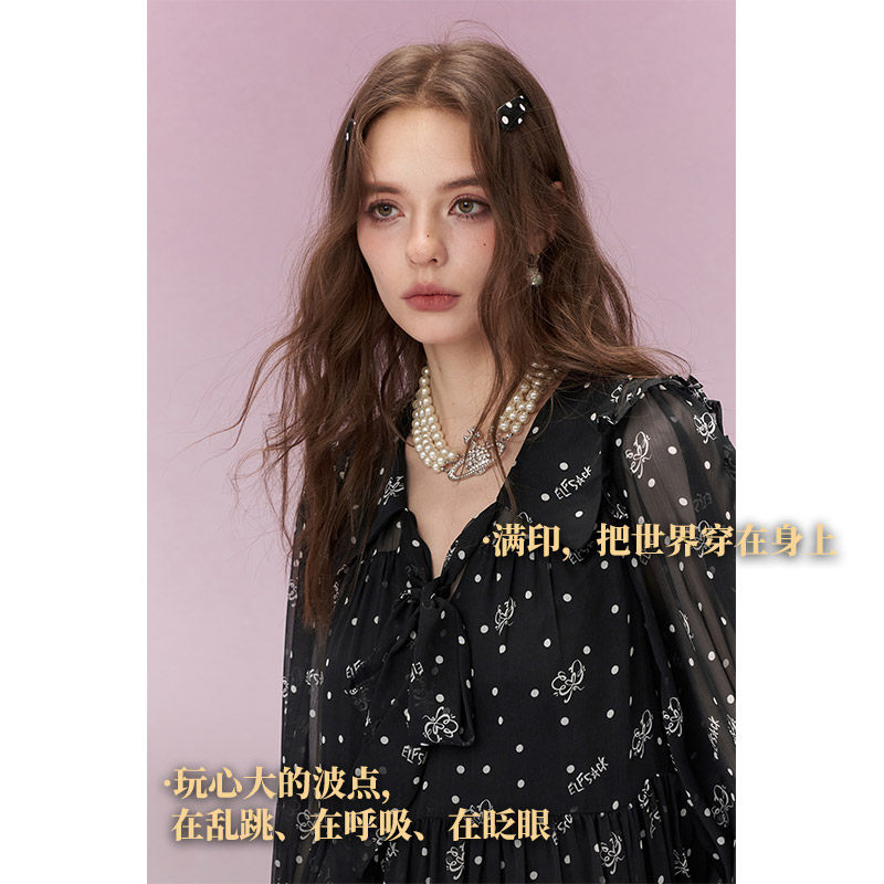 妖精的口袋娃娃领甜美波点黑色连衣裙女2026年春夏新款雪纺公主裙