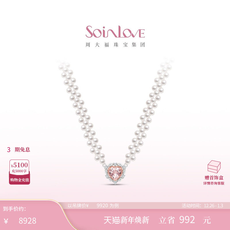 周大福SOINLOVE 月桂之心18K金摩根石钻石珍珠项链生日礼物