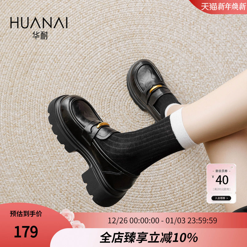 华耐粗跟乐福鞋女2025秋冬新款英伦风小皮鞋黑色JK通勤一脚蹬单鞋