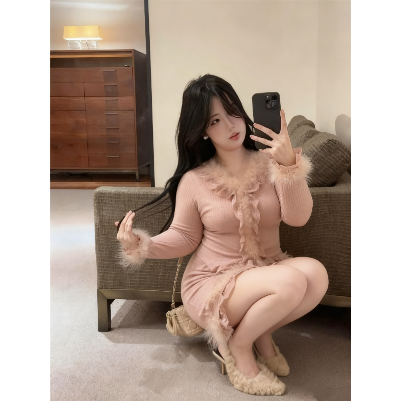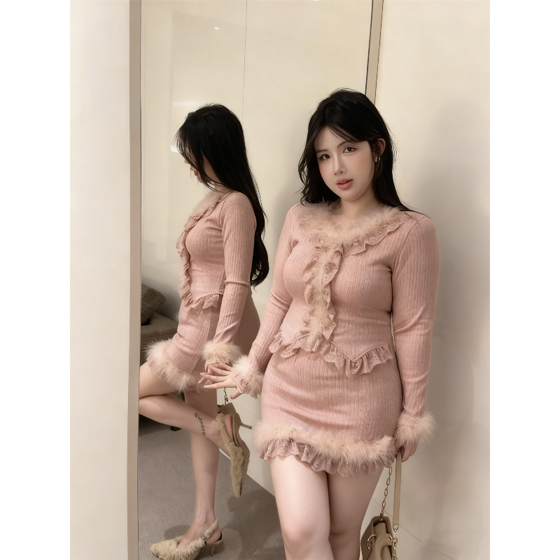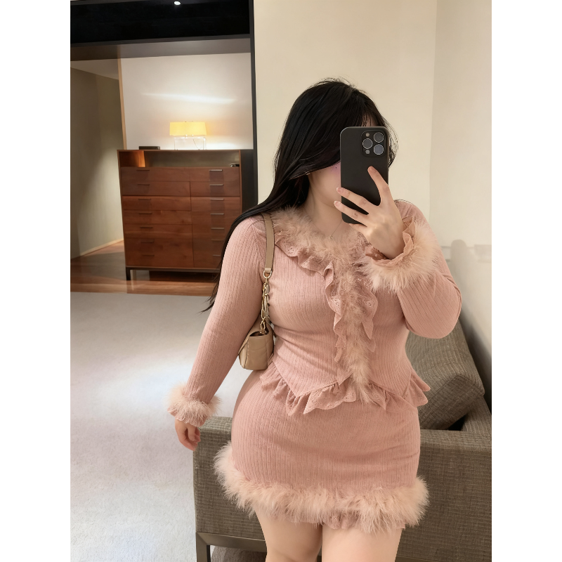 小众甜美风秋季2025新款大码胖mm显瘦设计感毛毛上衣包臀裙两件套