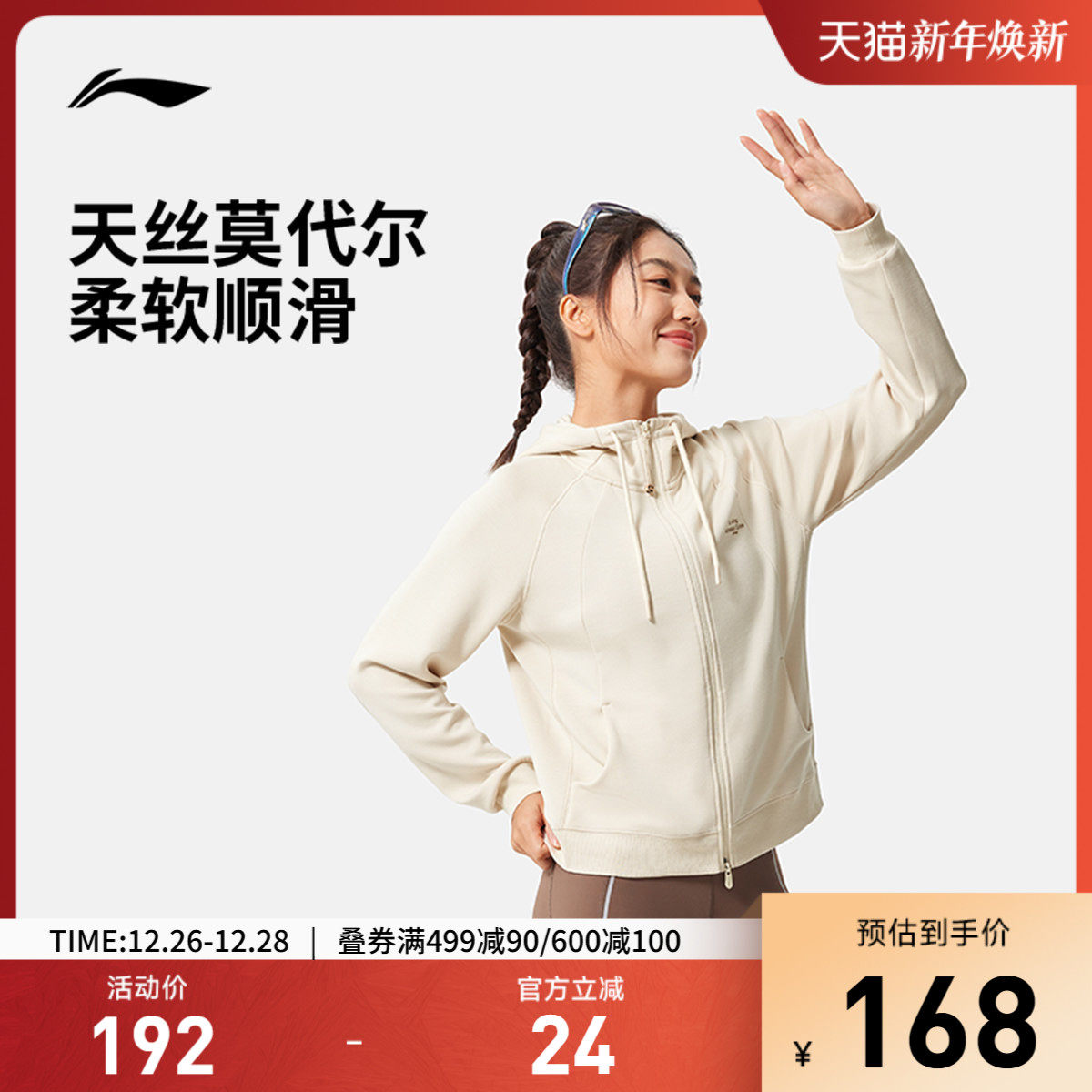 李宁卫衣女秋冬新款女装连帽修身健身开衫外套加绒针织上衣运动服