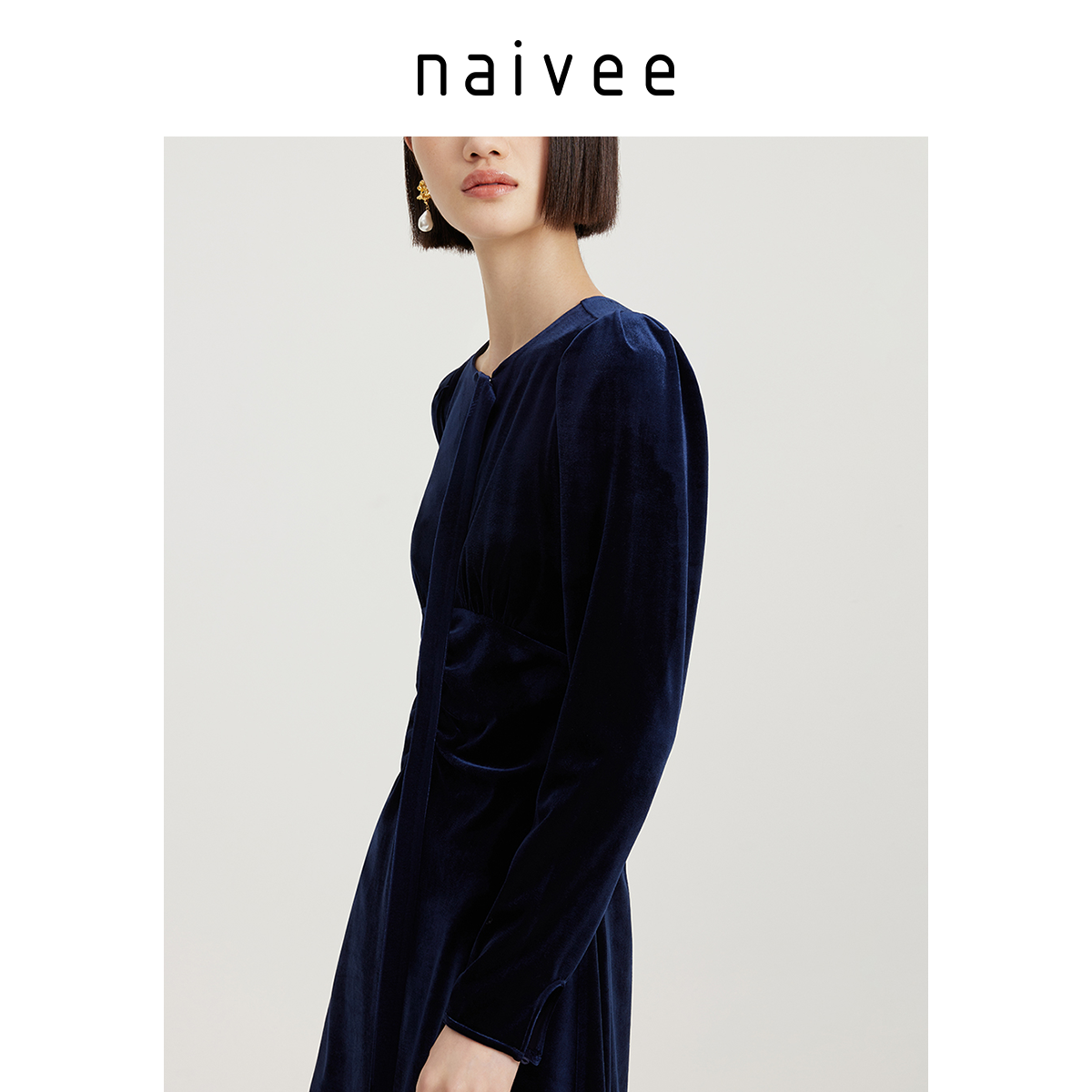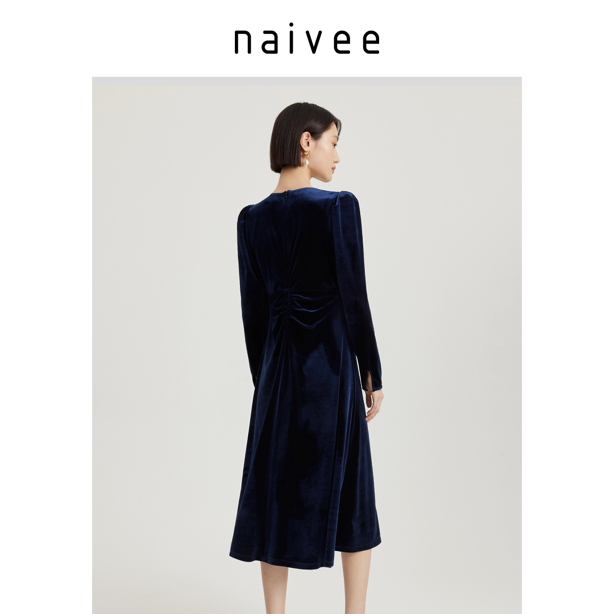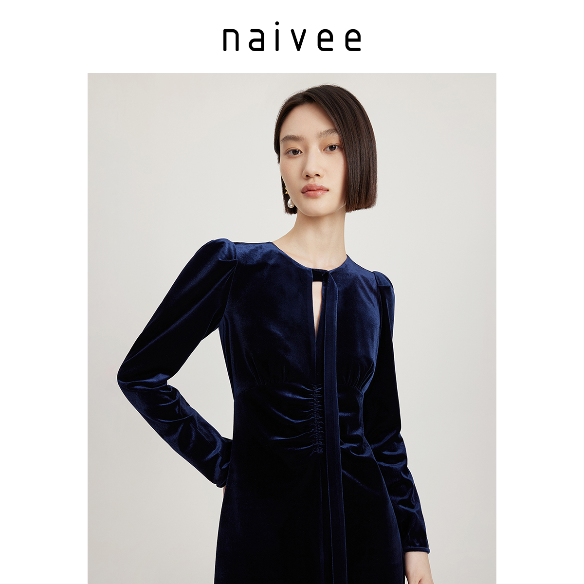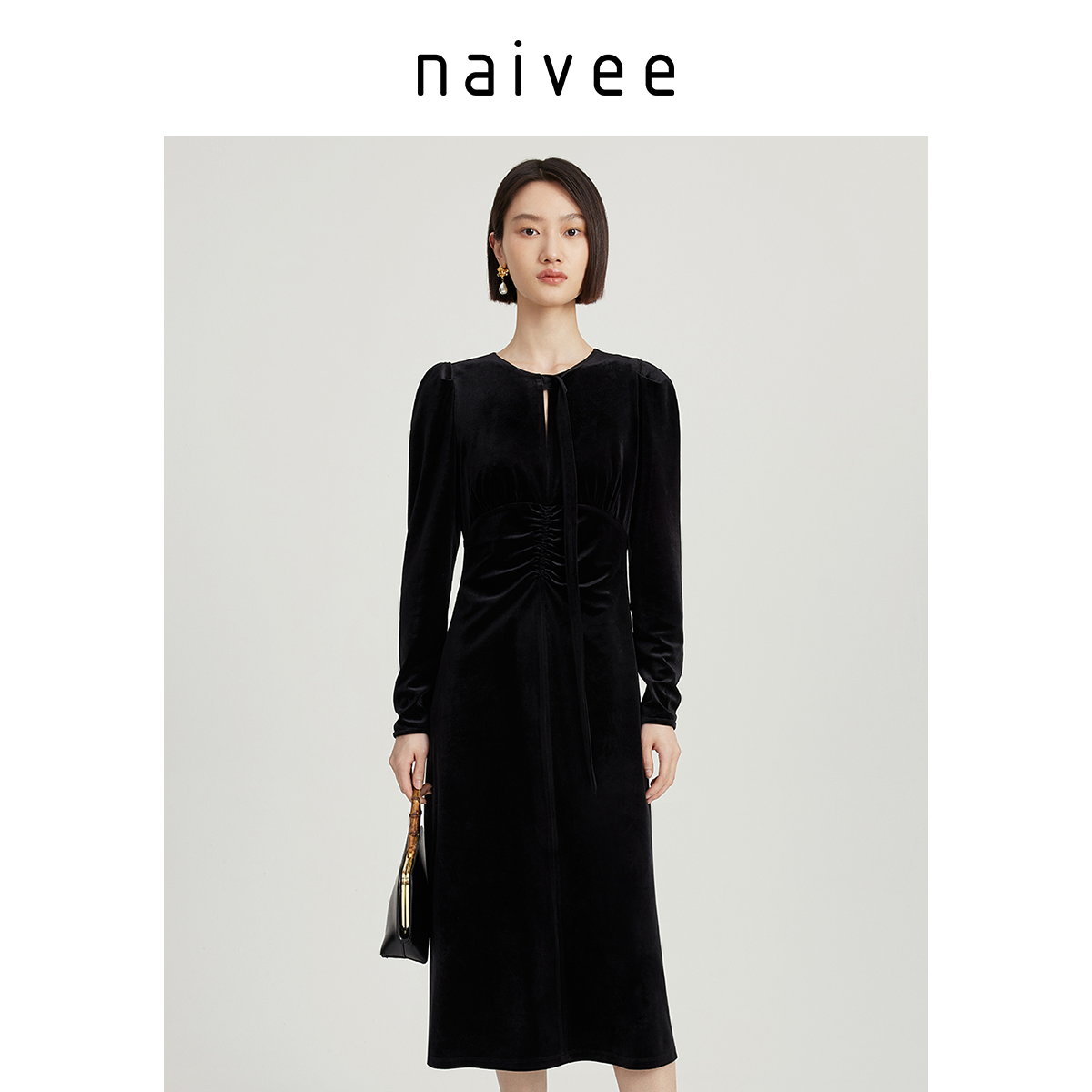 商场同款naivee纳薇飘带时尚收腰丝绒针织X型赴宴轻礼服连衣裙