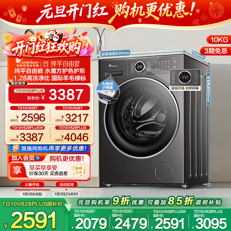 [纯平自由嵌]小天鹅洗衣机10KG家用水魔方滚筒洗脱一体628T/PLUS