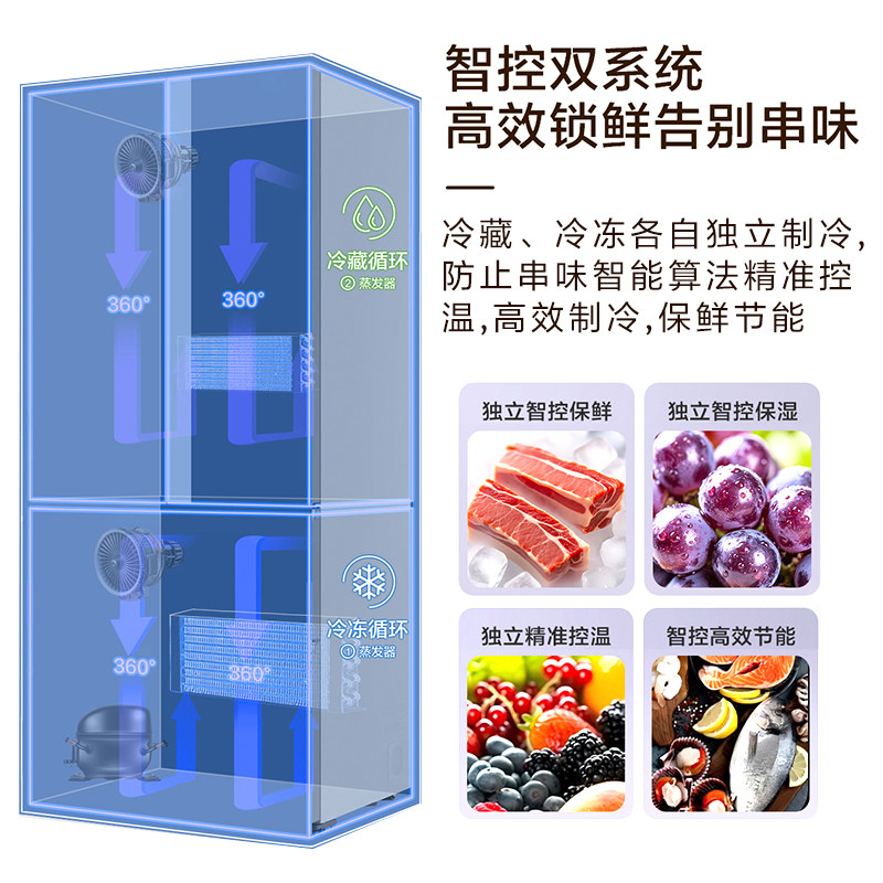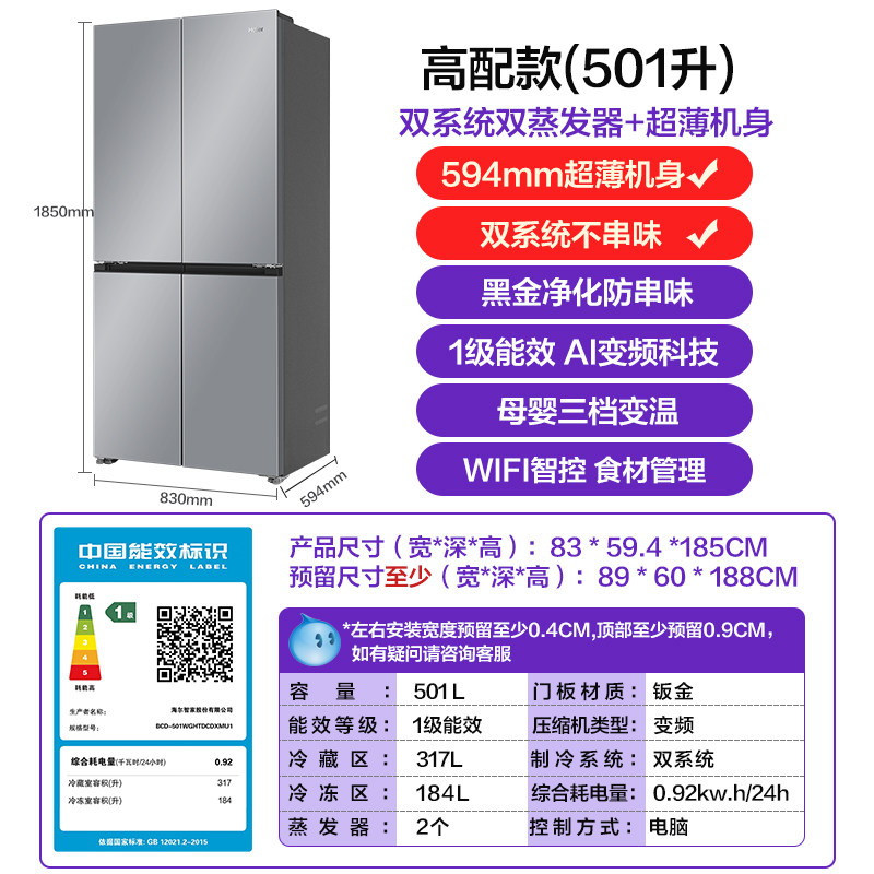 【双系统双蒸发器】海尔小红花501L十字四门超薄变频家用冰箱新品