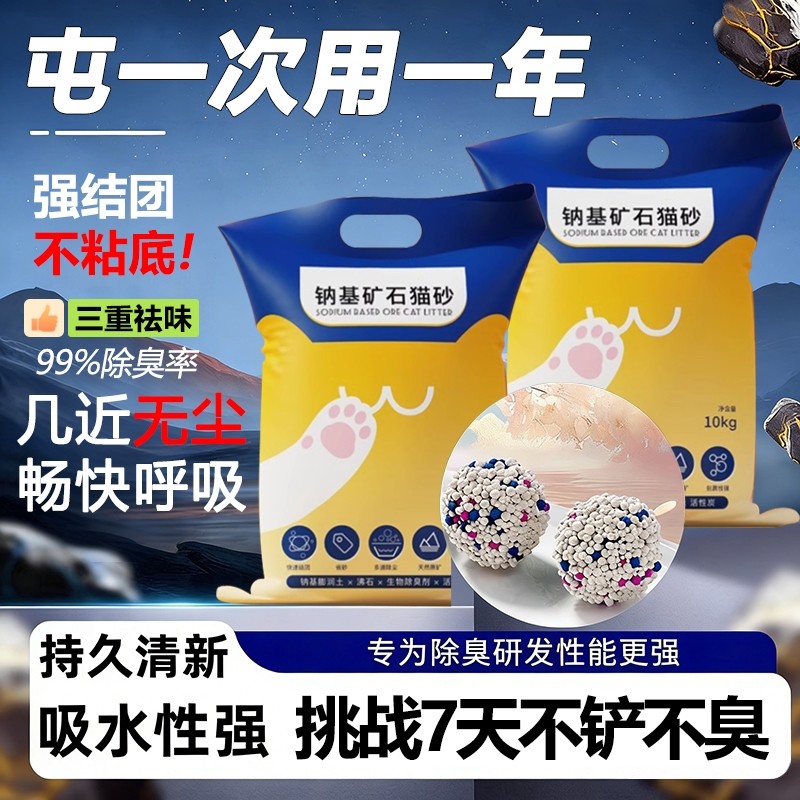 天然钠基矿石猫砂10斤低尘矿砂活性炭除臭吸水结团矿石膨润土猫砂