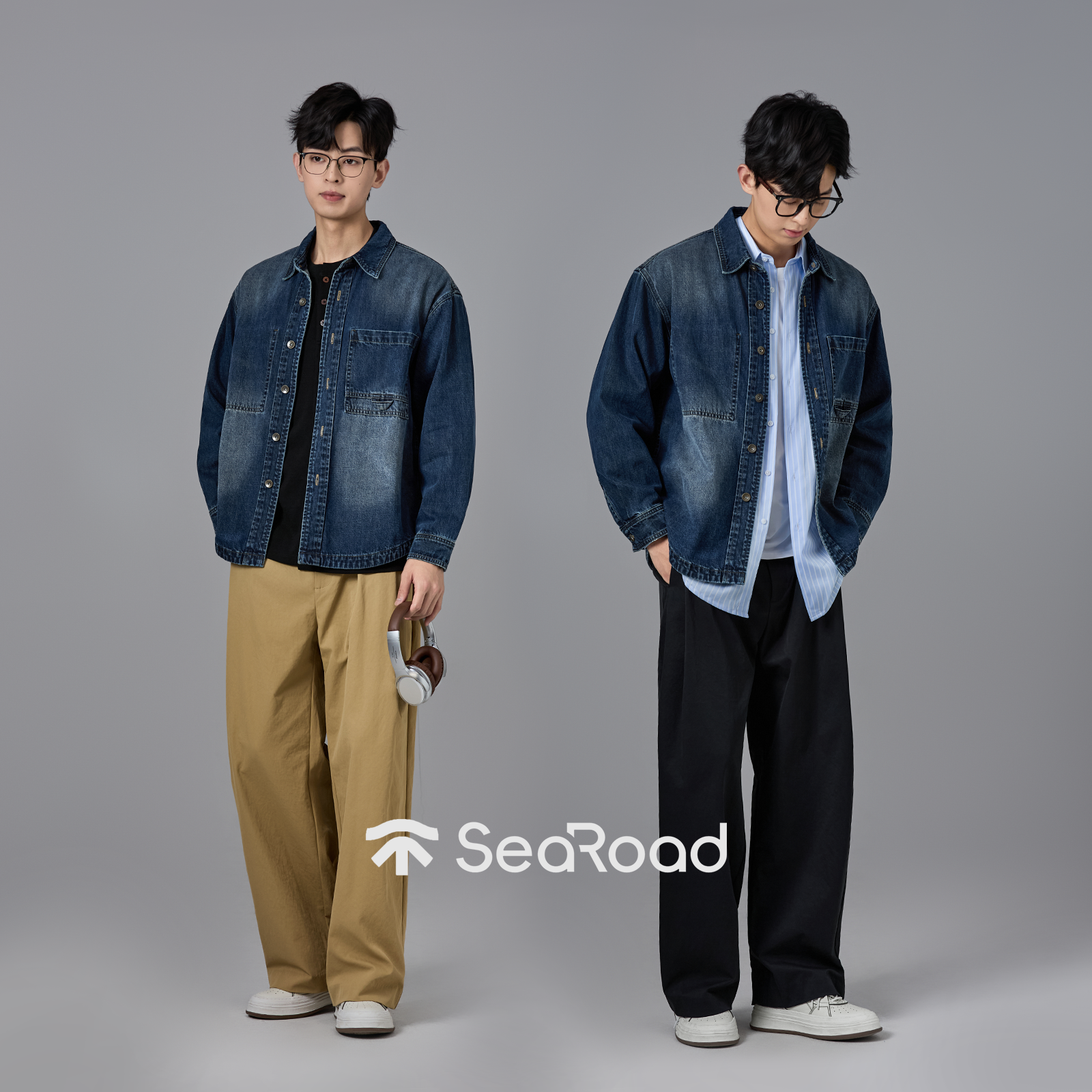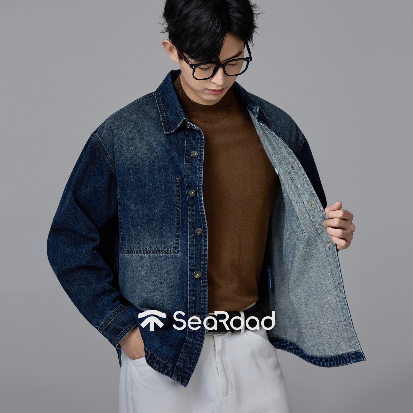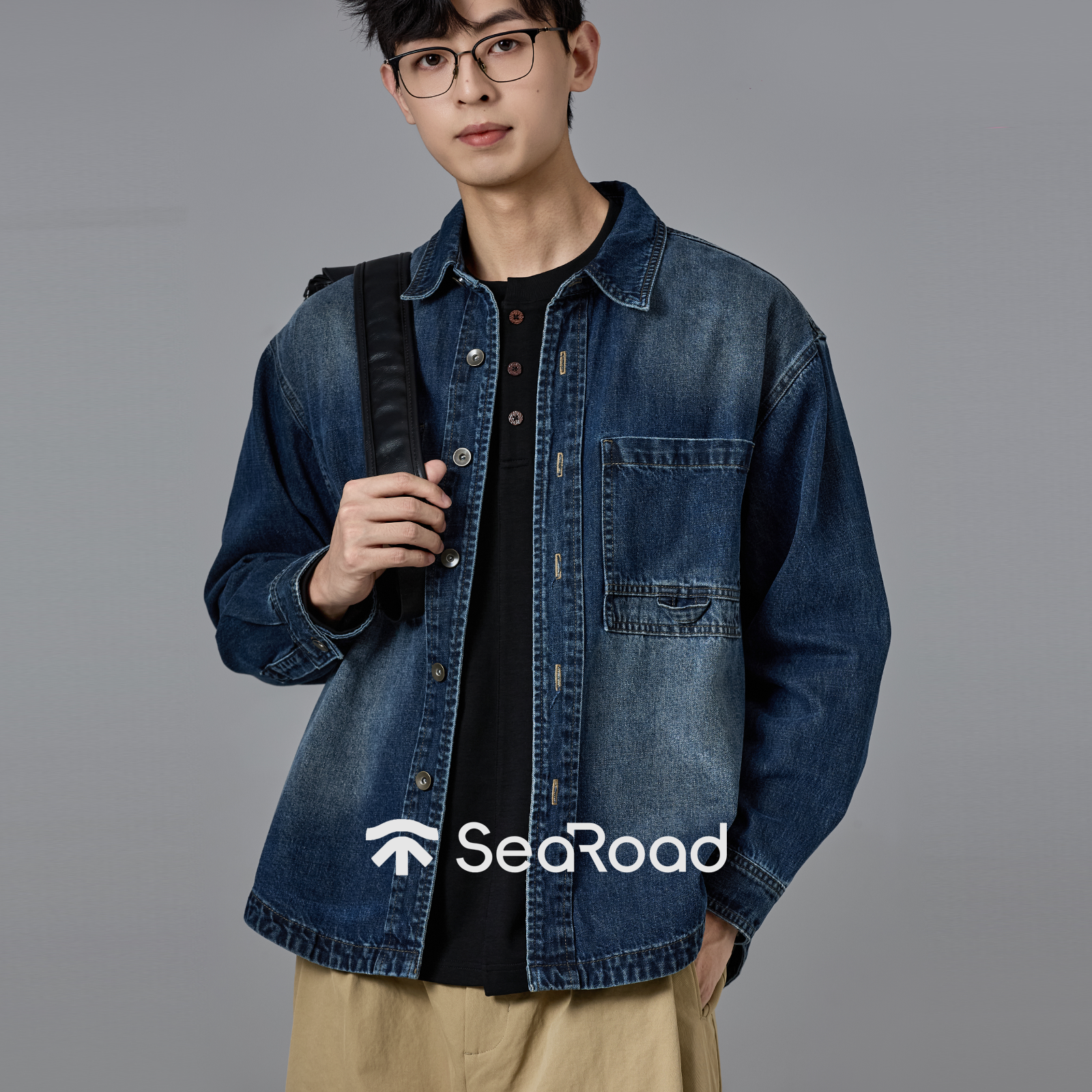 海上公路重磅内外贴袋衬衫男士秋季复古做旧廓形工装牛仔夹克外套