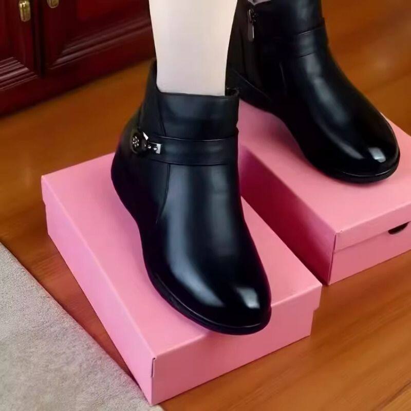 2025冬季新款坡跟软底加绒加厚保暖妈妈棉鞋软皮平底短靴女棉鞋