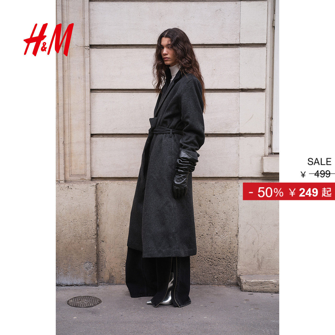 HM女装毛呢外套冬季时尚腰部系带保暖大衣1228998