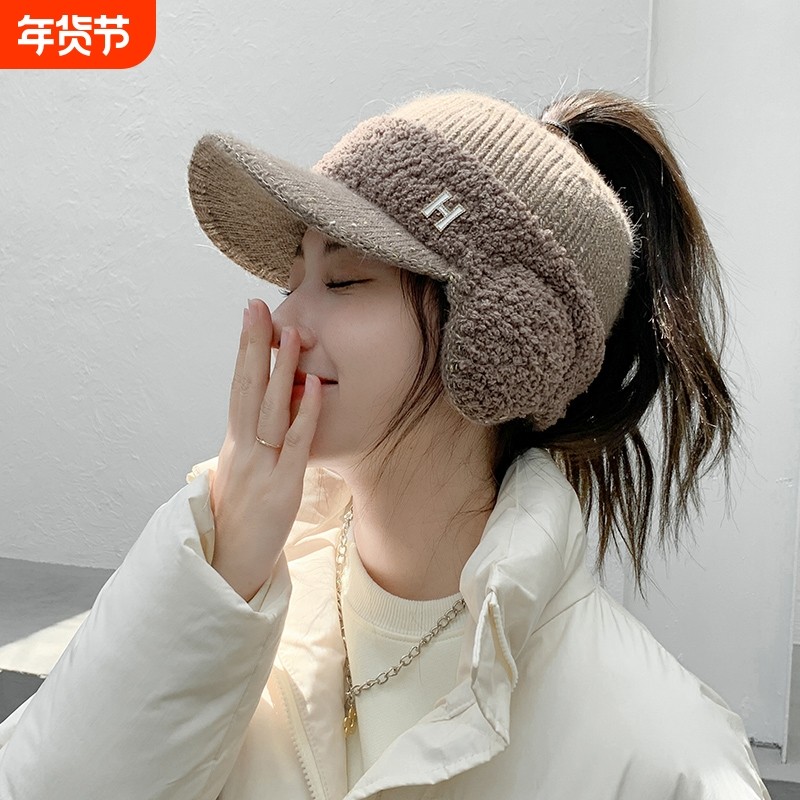 针织毛线空顶帽女秋冬季毛绒耳包护耳帽子户外运动保暖空顶扎马尾