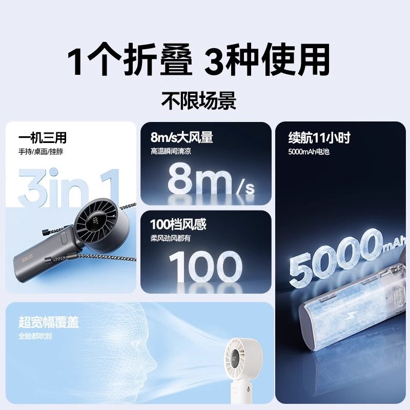 向物手持小风扇大风力静音充电便携小型折叠挂脖桌面宿舍夏天户外