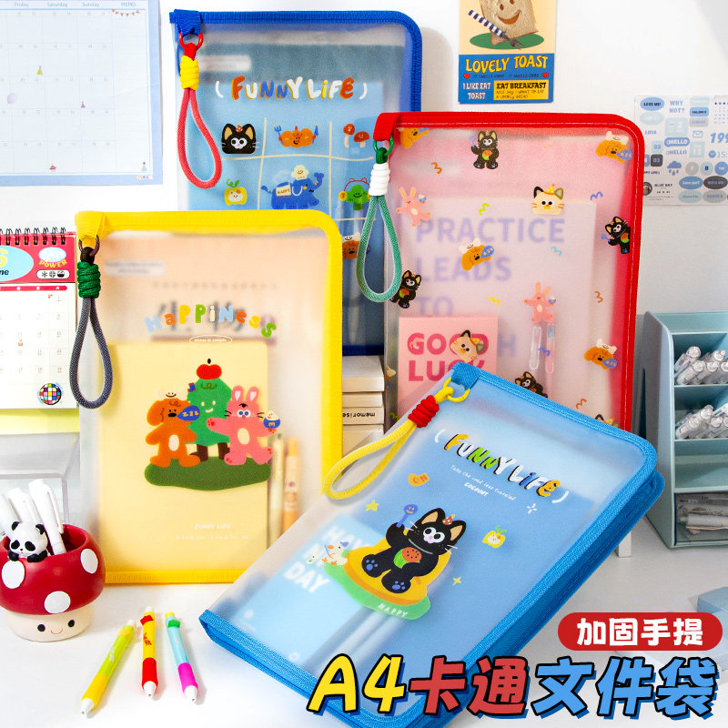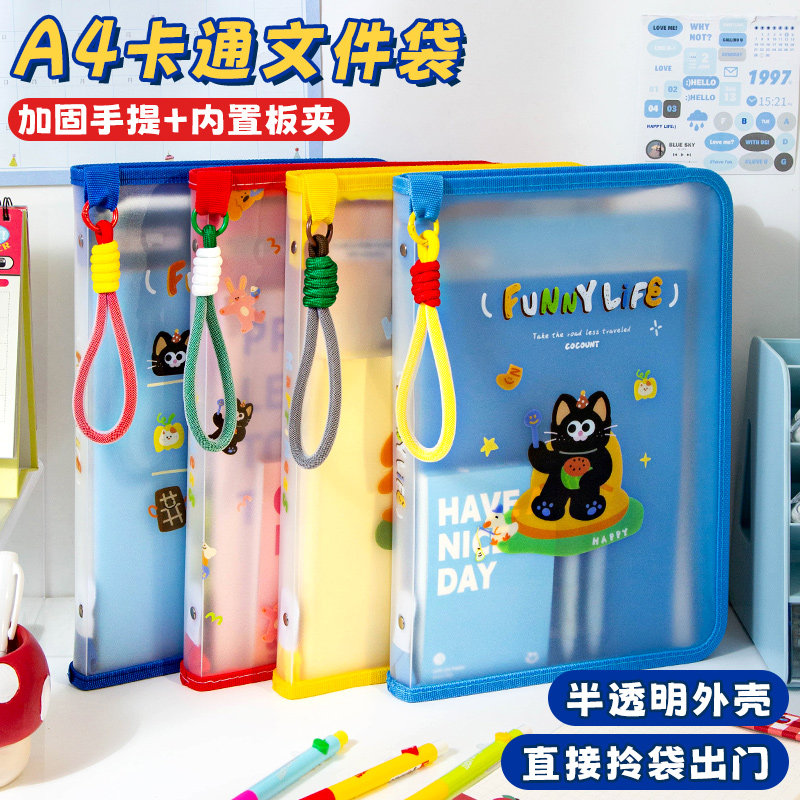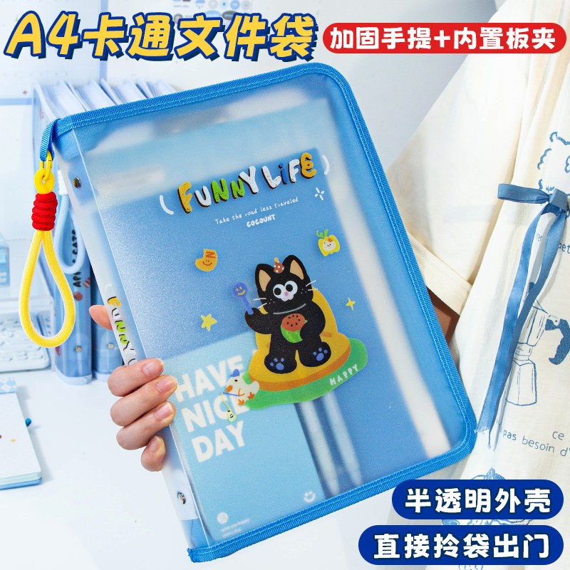 小槑同学 内置板夹!A4半透明拉链式文件袋大开口小学生手提拎书袋加厚防水资料试卷收纳袋初中补习袋补课包
