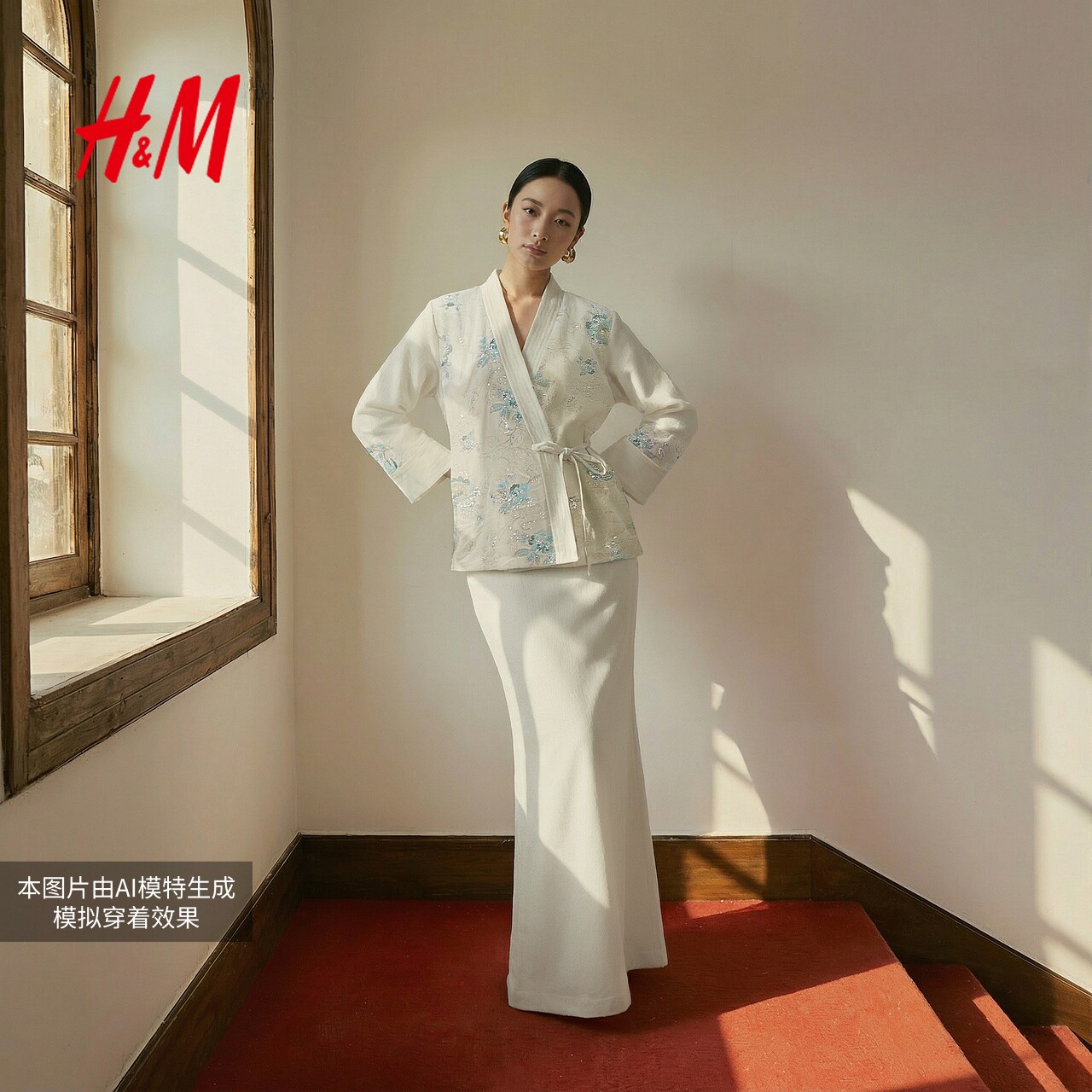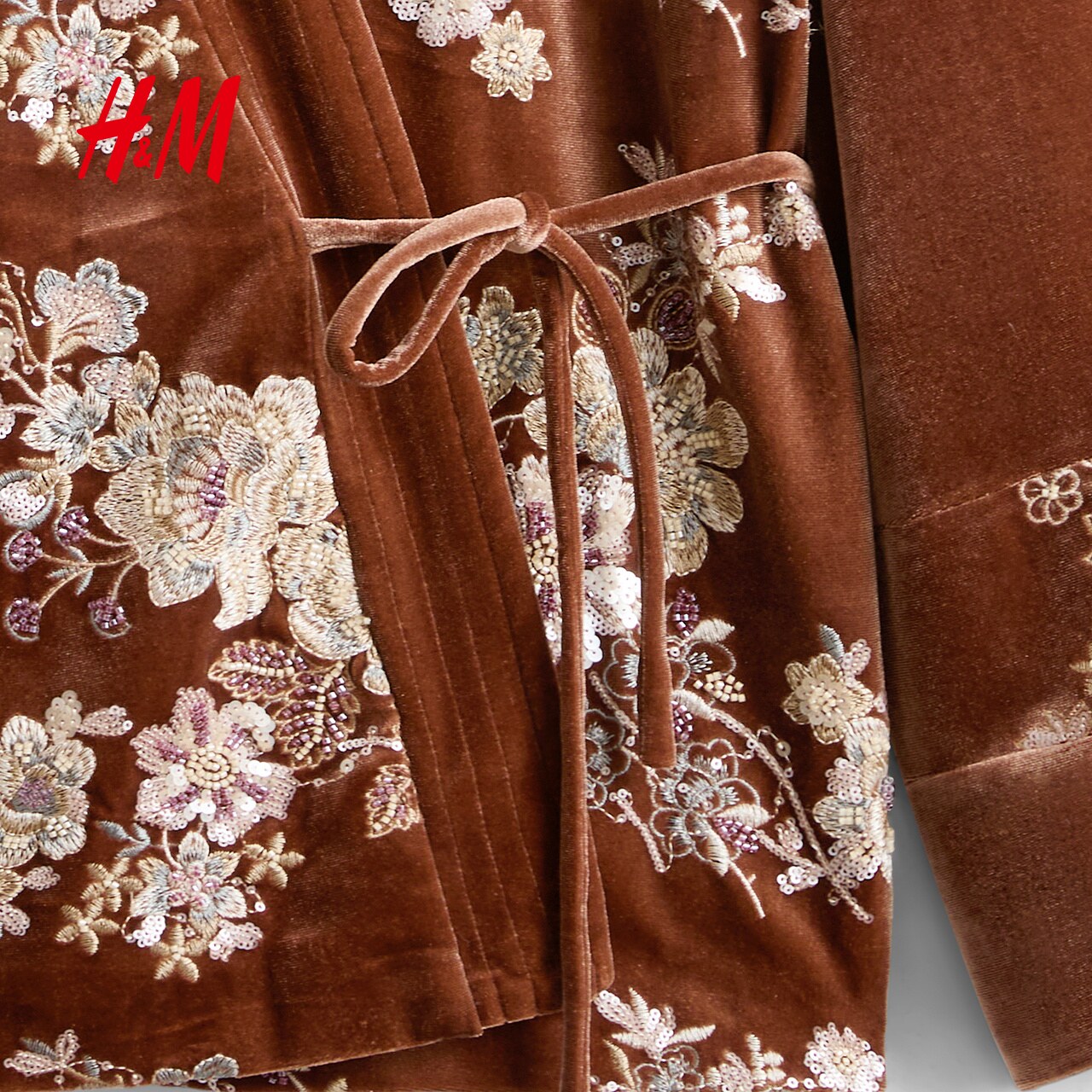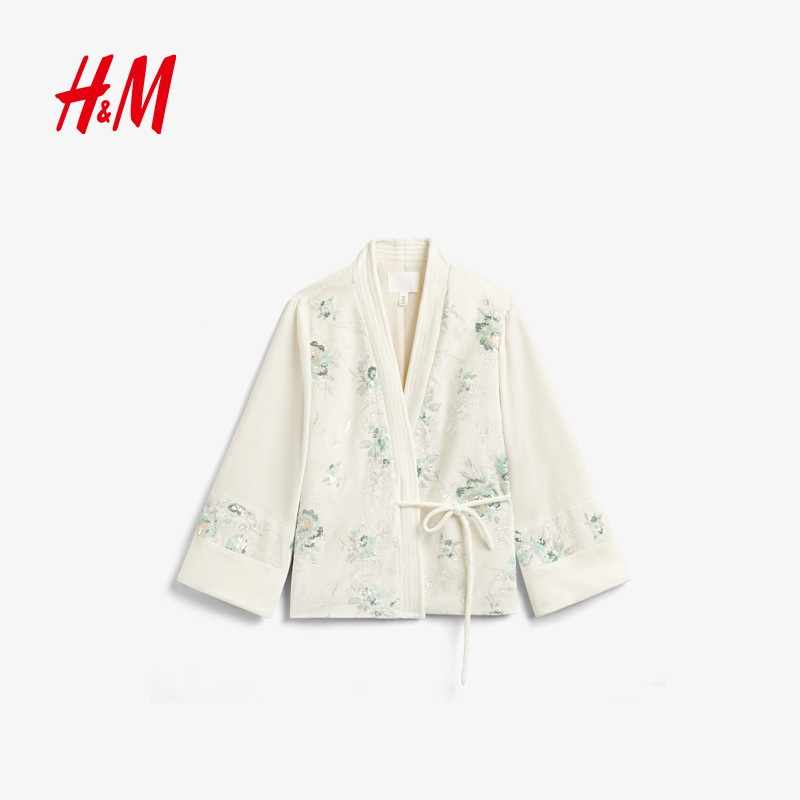HM女装短外套春季新款新中式重工刺绣钉珠丝绒系带款外套1000066