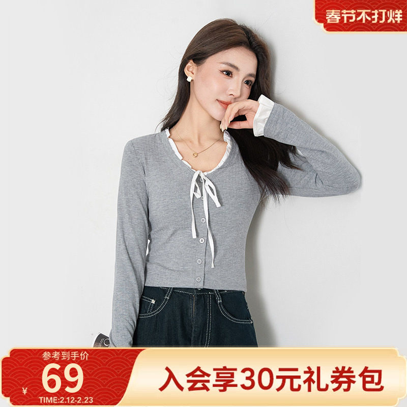 热风女士甜美蕾丝假两件学院风修身针织打底衫秋季韩系千金风内搭