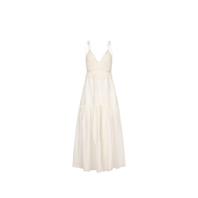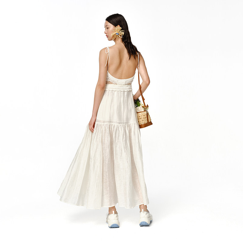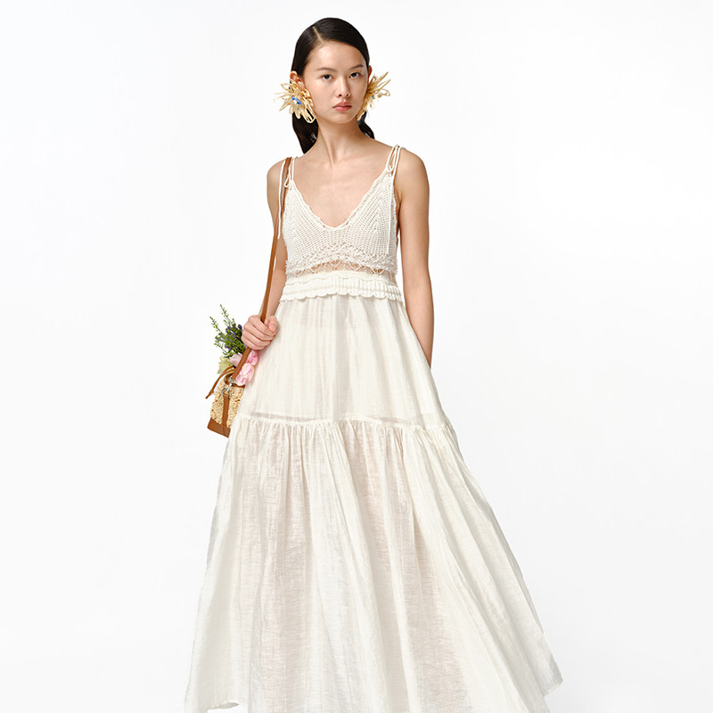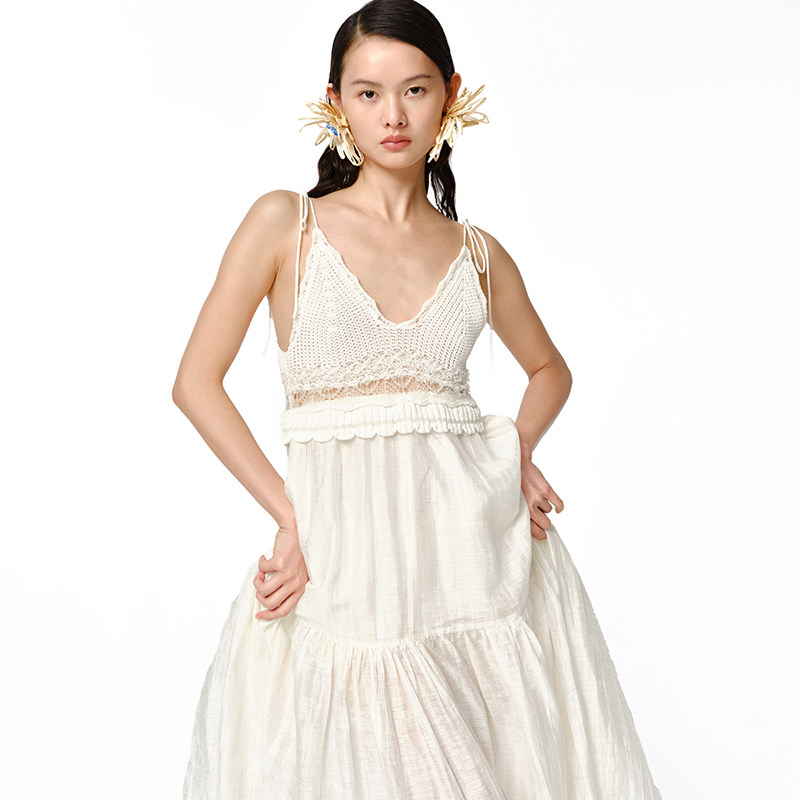 【XIAOLI筱李】春夏白色针织亚麻拼接吊带连衣裙度假裙