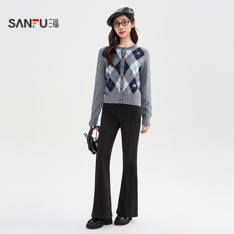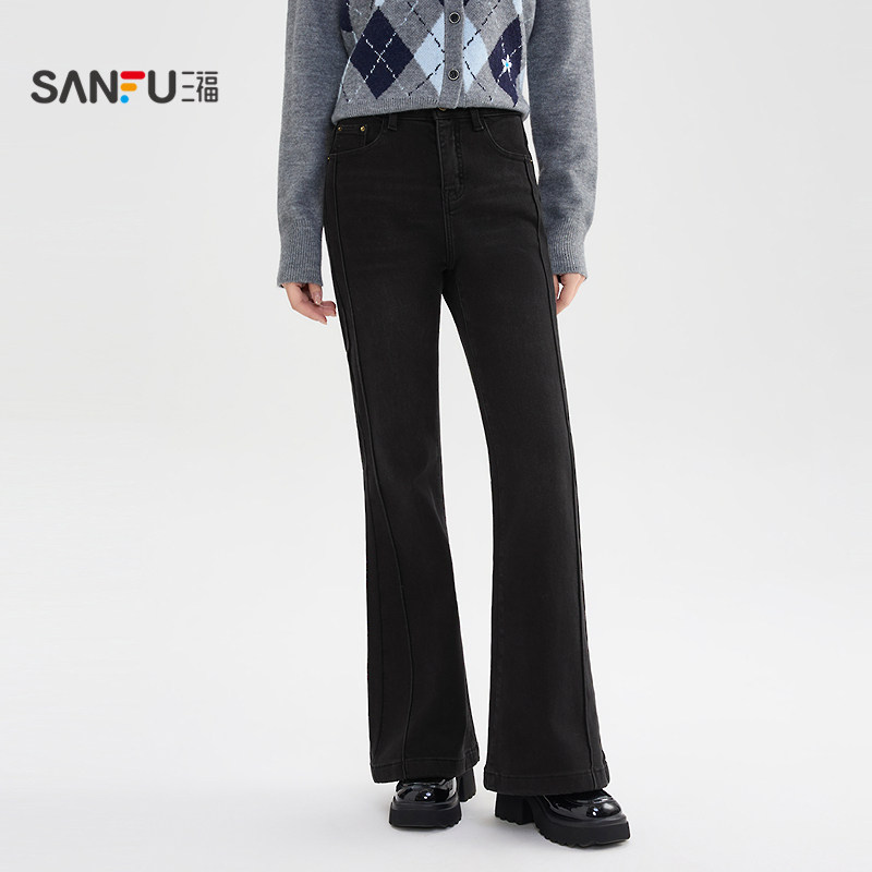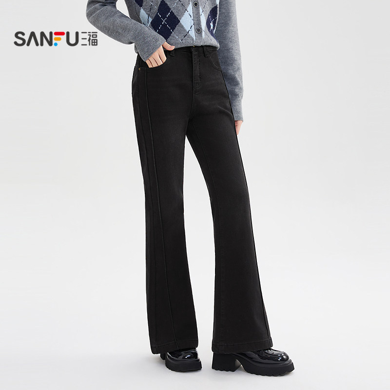 三福牛仔长裤2025新款冬季保暖抓绒高腰喇叭裤显瘦裤子女装513448