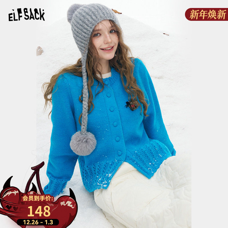 妖精的口袋甜美蓝色镂空拼接新年毛衣女2025冬新款慵懒风甜美内搭