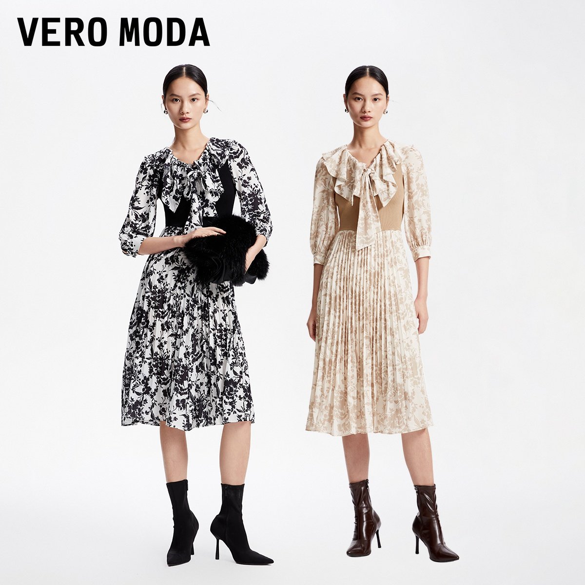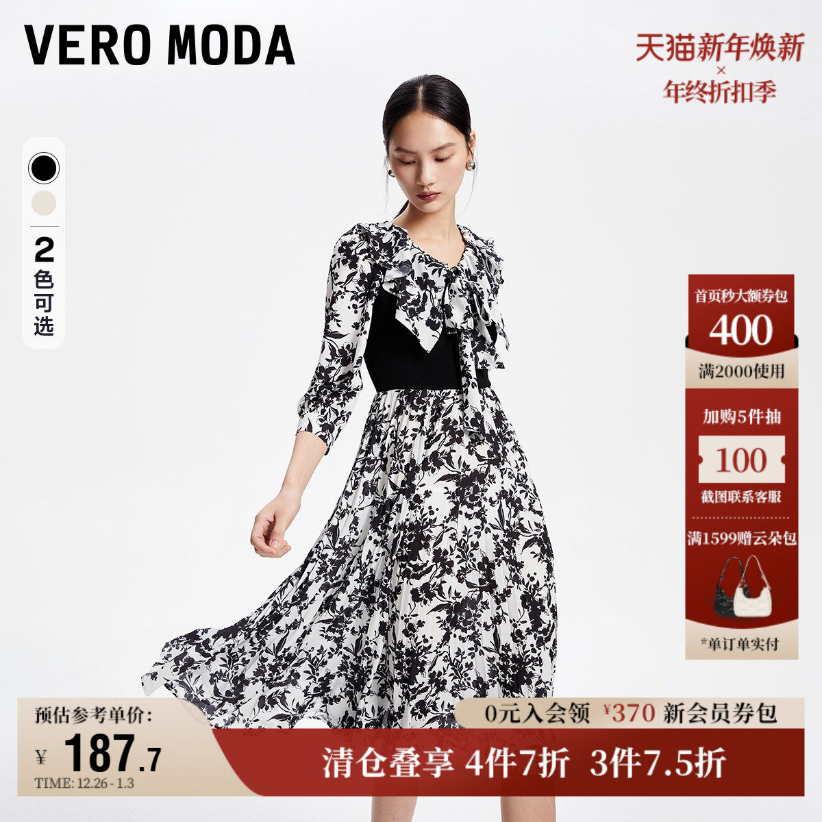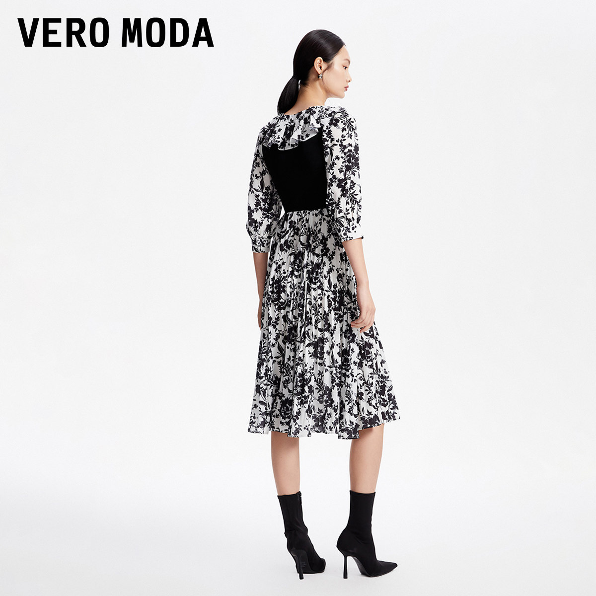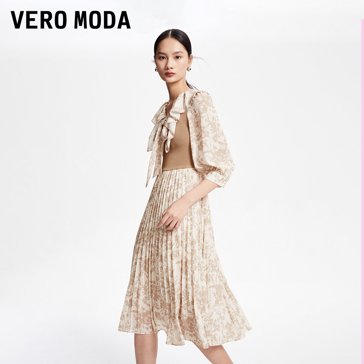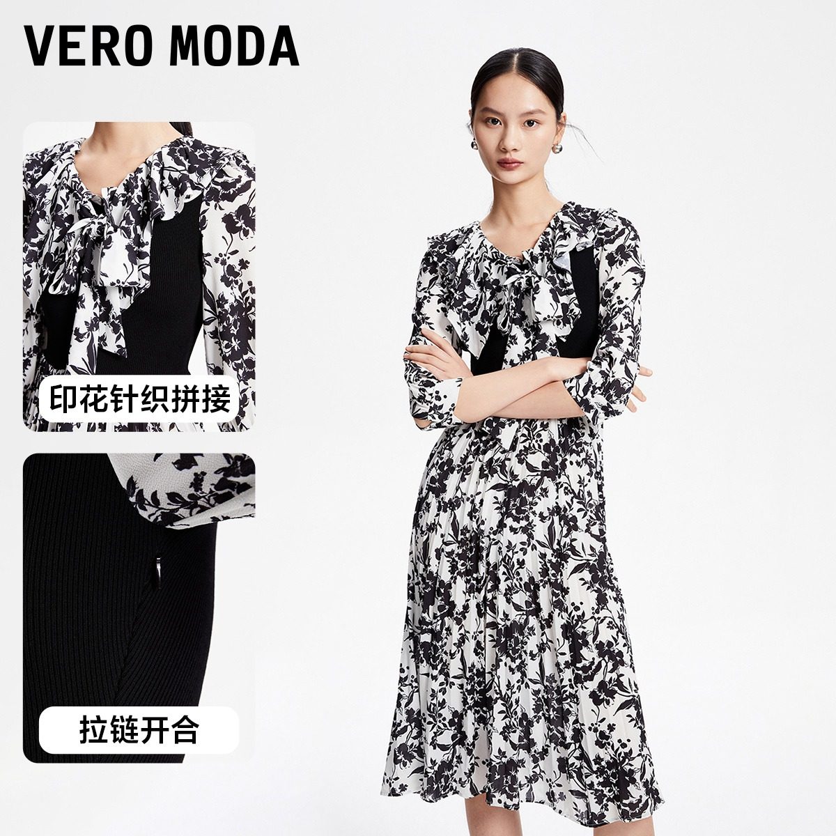 Vero Moda奥莱连衣裙子秋冬清仓优雅气质甜美七分袖印花拼接女