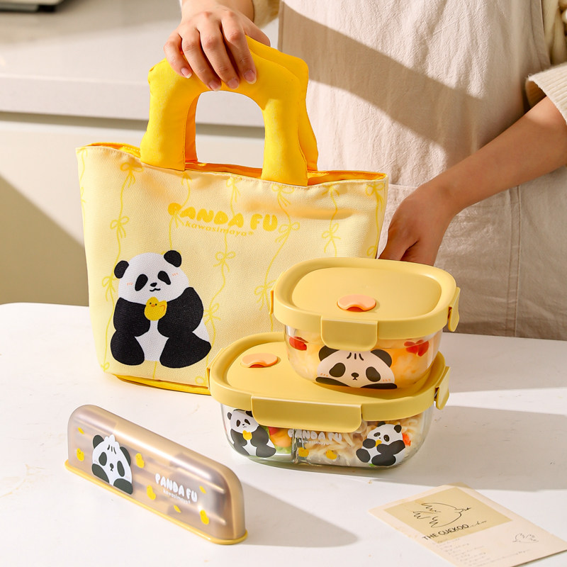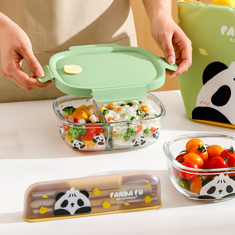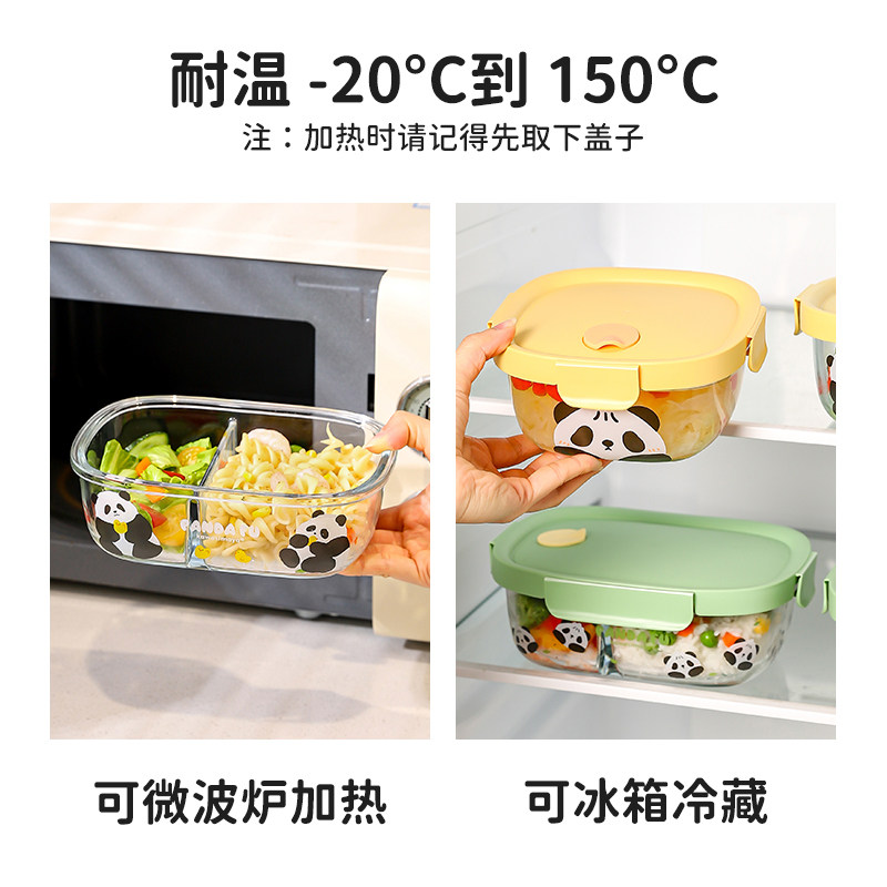 川岛屋熊猫玻璃饭盒微波炉加热专用上班族带饭餐盒水果便当保鲜盒