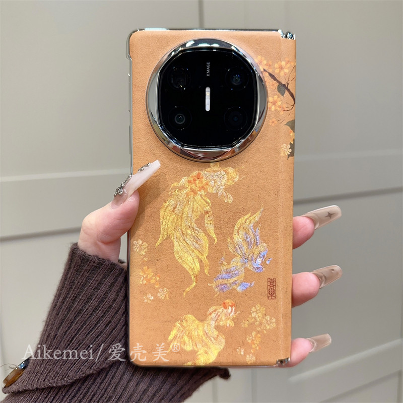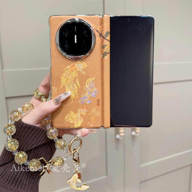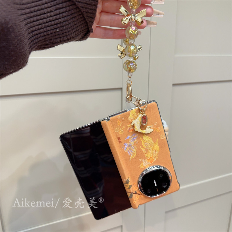 适用华为MateX7典藏版折叠屏手机壳matex6喜庆新年国风皮质MateX5典藏版链海棠花锦鲤matex3中轴保护链条女款