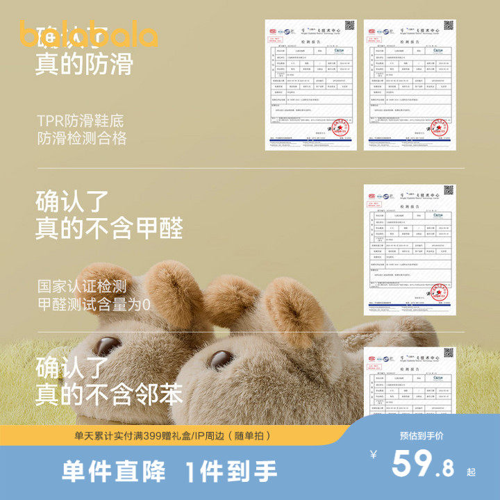 巴拉巴拉儿童秋冬棉拖鞋居家鞋女童毛绒鞋子保暖小熊造型包跟棉鞋