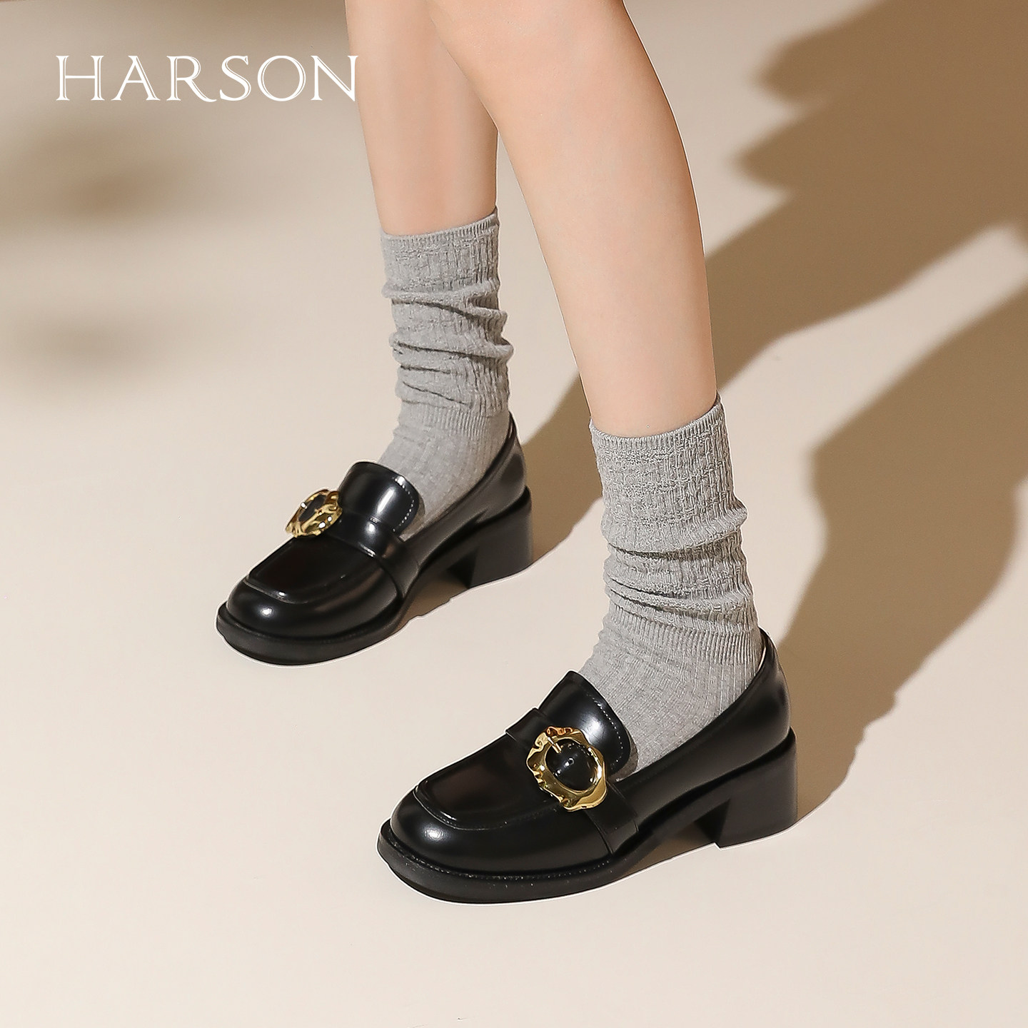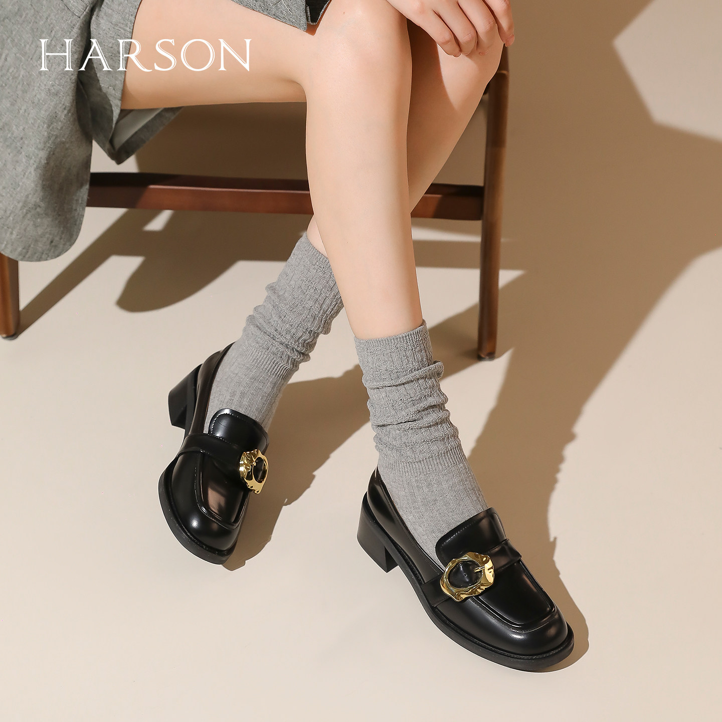 哈森气质休闲乐福鞋女鞋春秋款英伦风圆头粗跟单鞋女HL237120