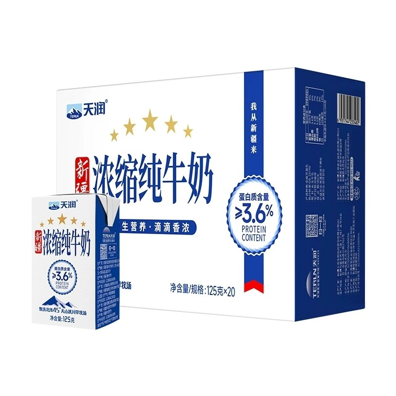 新疆天润浓缩纯牛奶125g×20盒装天山牧场官方旗舰店早餐纯奶整箱