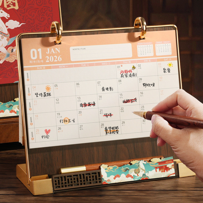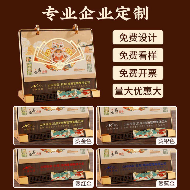 马年台历2026年新款定制创意木质日历多功能办公室桌面摆件国风月历商务记事计划本企业广告logo定做新年礼物
