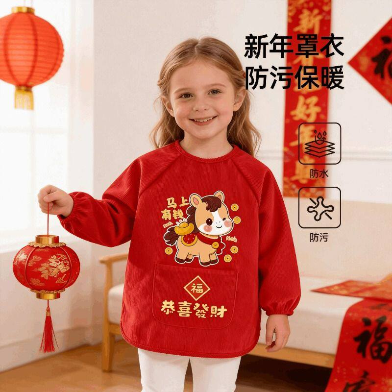 罩衣儿童喜庆马年拜年服宝宝新年大红围裙男女孩反穿衣秋冬外穿