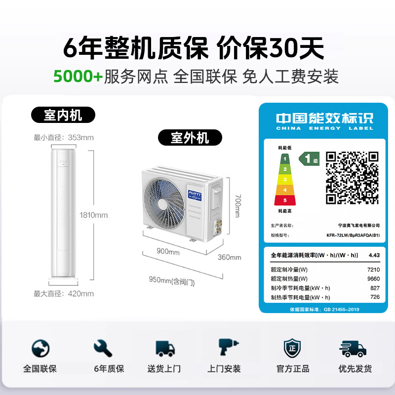 AUFIT空调奥克斯出品大3匹2P立式客厅家用一级变频冷暖柜机旗舰店