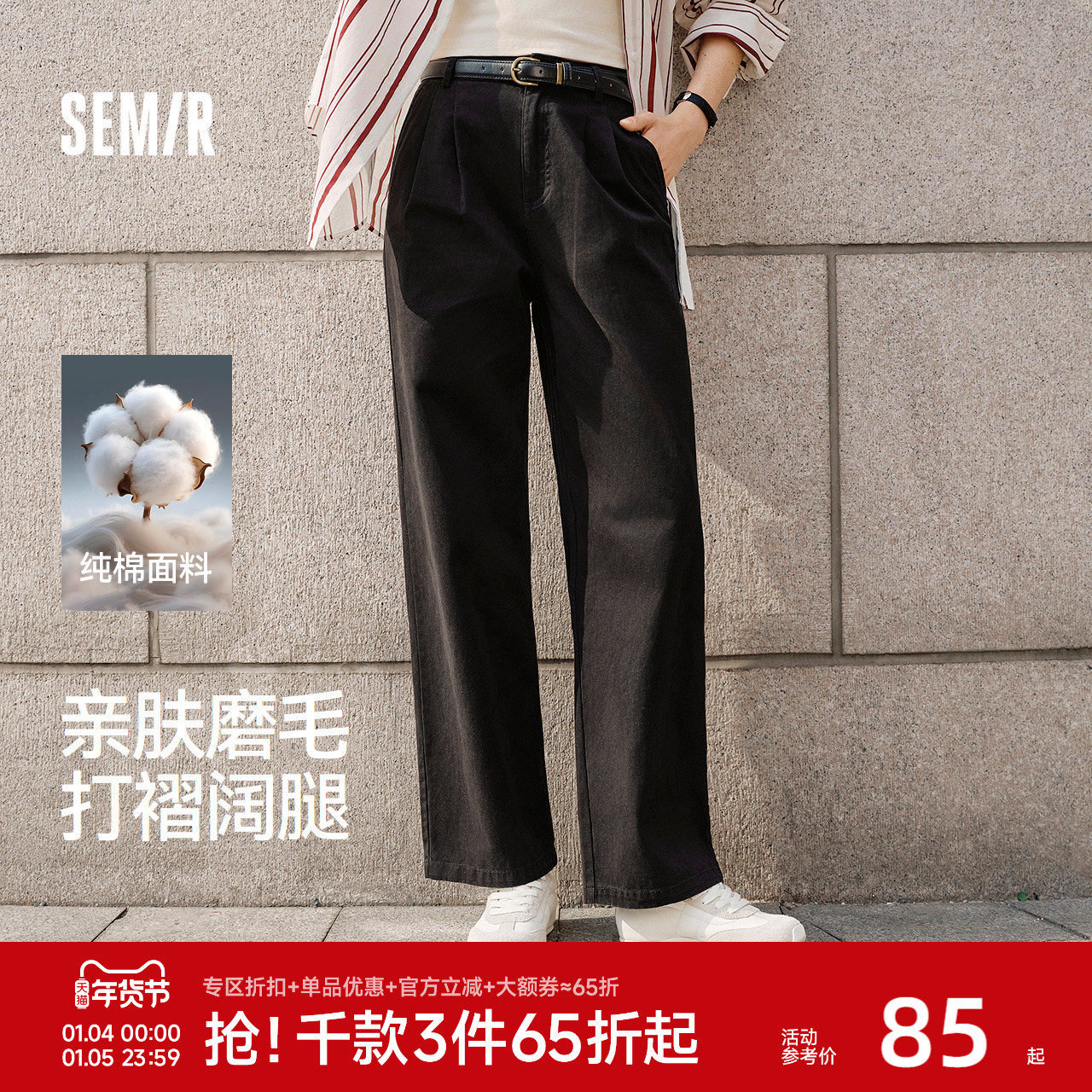森马休闲裤女纯棉打褶阔腿裤腰带盐系通勤秋季复古磨毛长裤显腿长