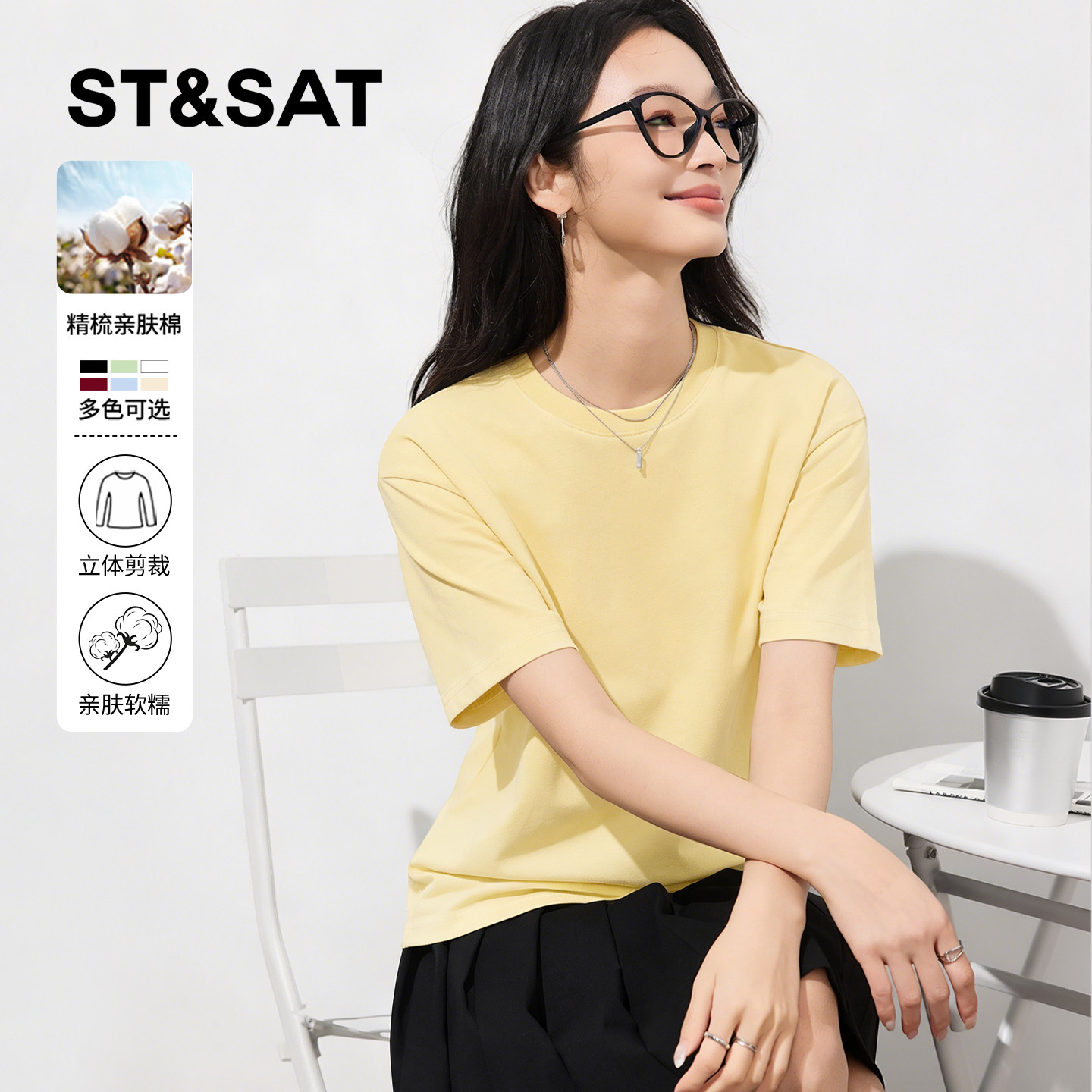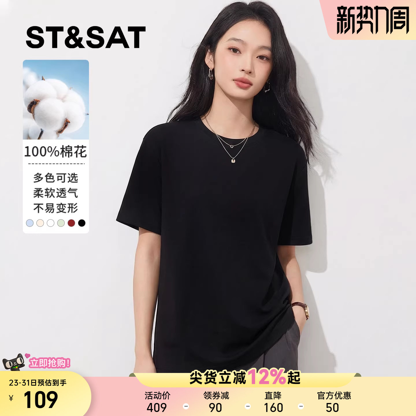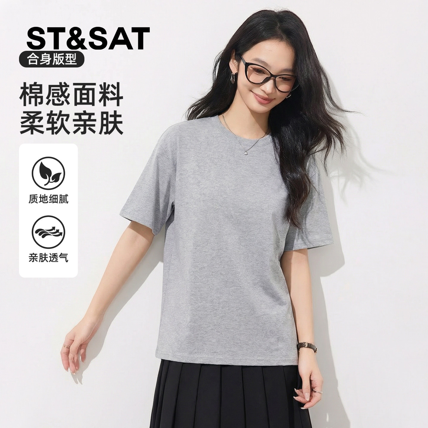 陈都灵丨凉感T森马短袖T恤女修身纯色基础夏季新款圆领白色女装