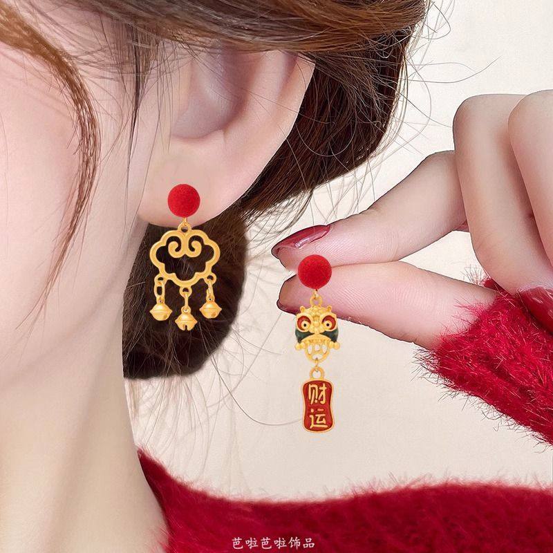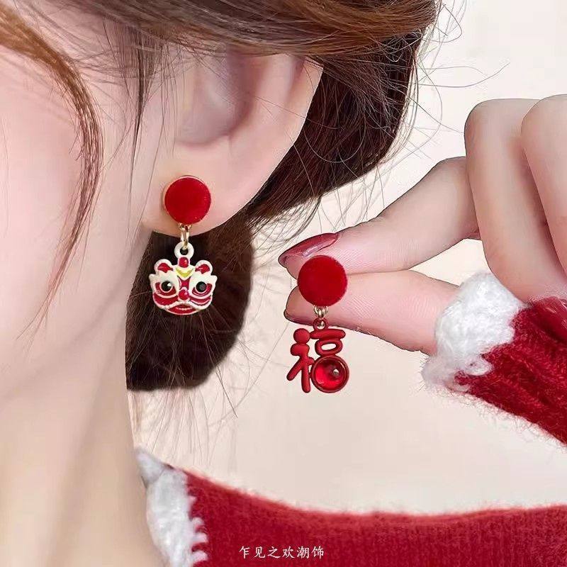 醒狮新年过年耳钉耳夹适合秋冬的红色耳环女小众独特气质高级耳饰