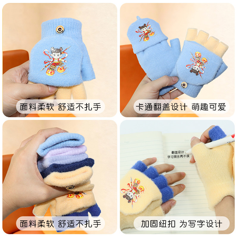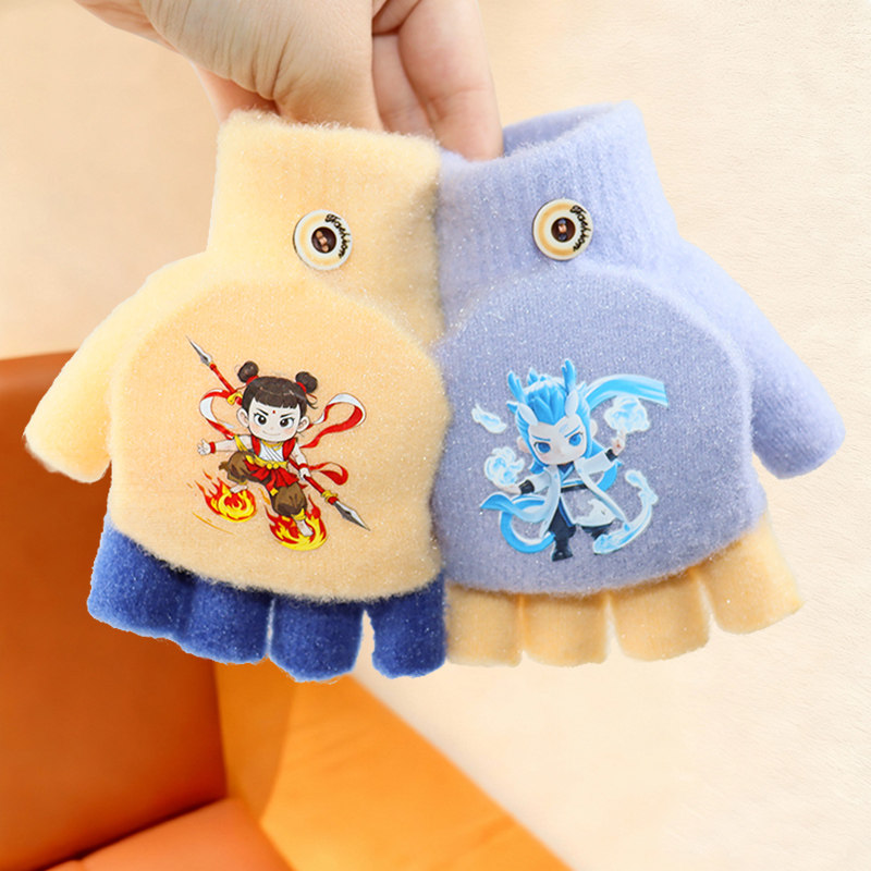 宝宝儿童手套男童女童半指五指卡通学生保暖写字翻盖加厚冬季手套