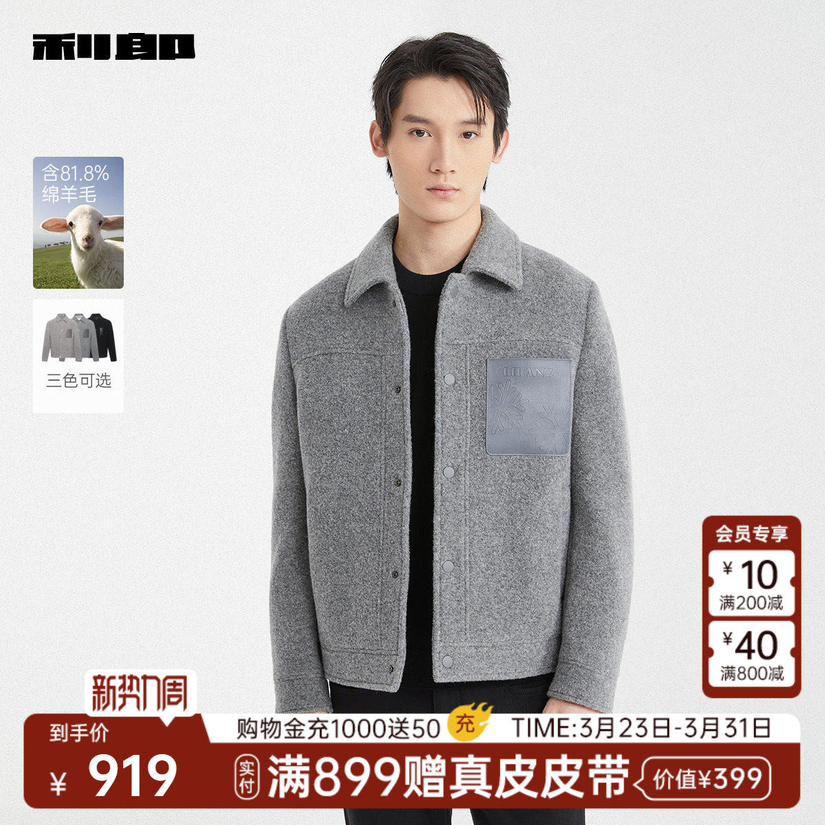 【含绵羊毛】利郎官方 毛呢大衣男士翻领冬季压花时尚外套