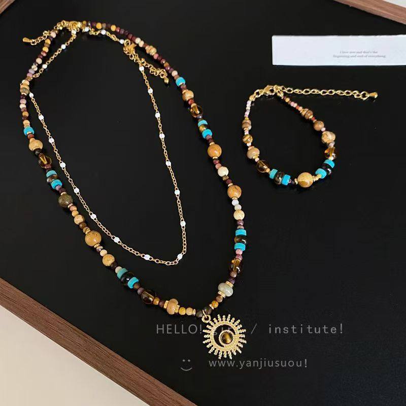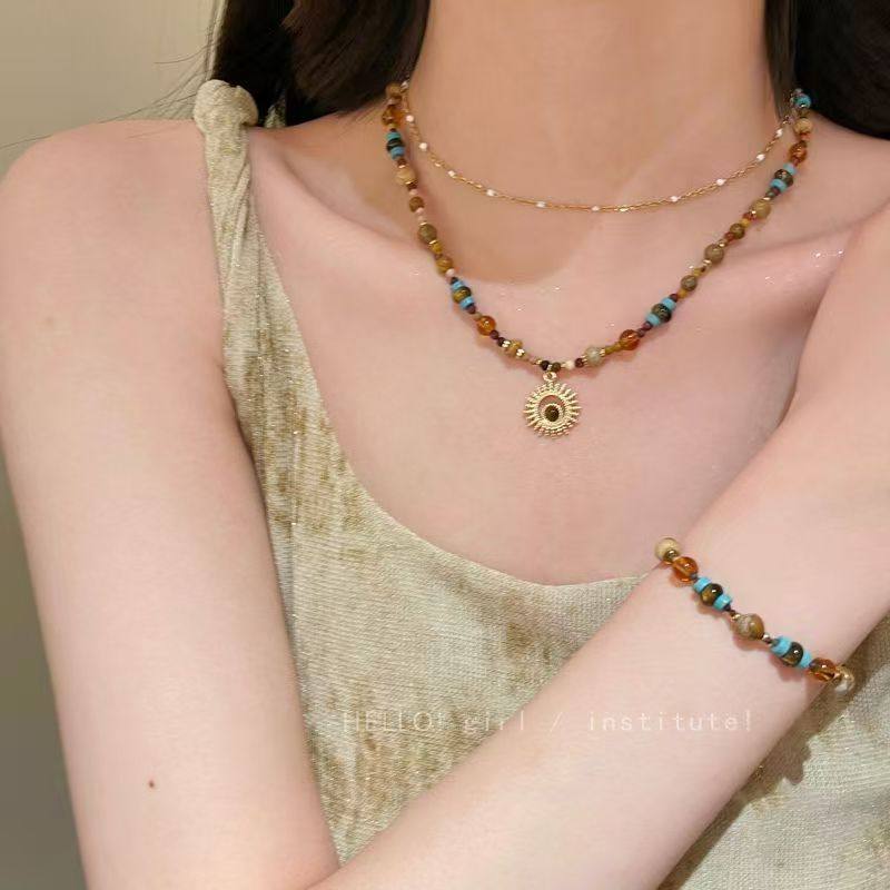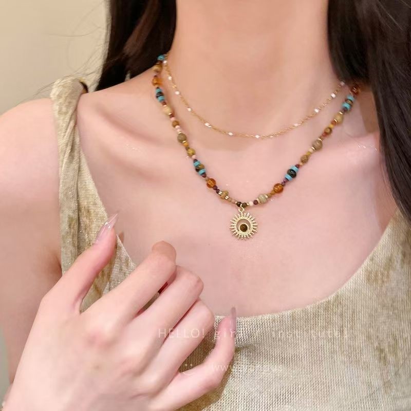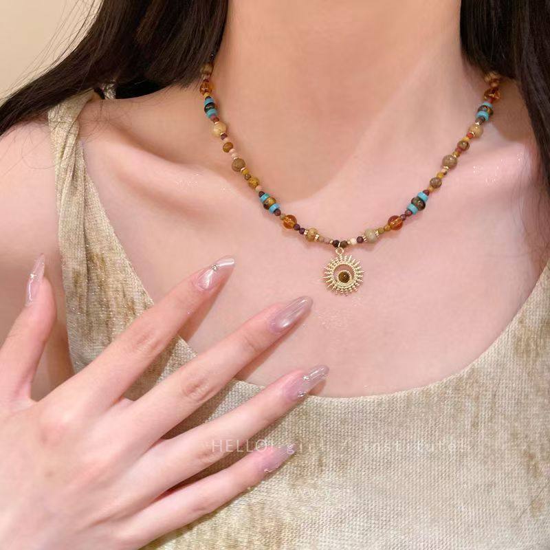 美拉德复古太阳花串珠项链高级感轻奢小众锁骨链民族风叠戴卫衣链
